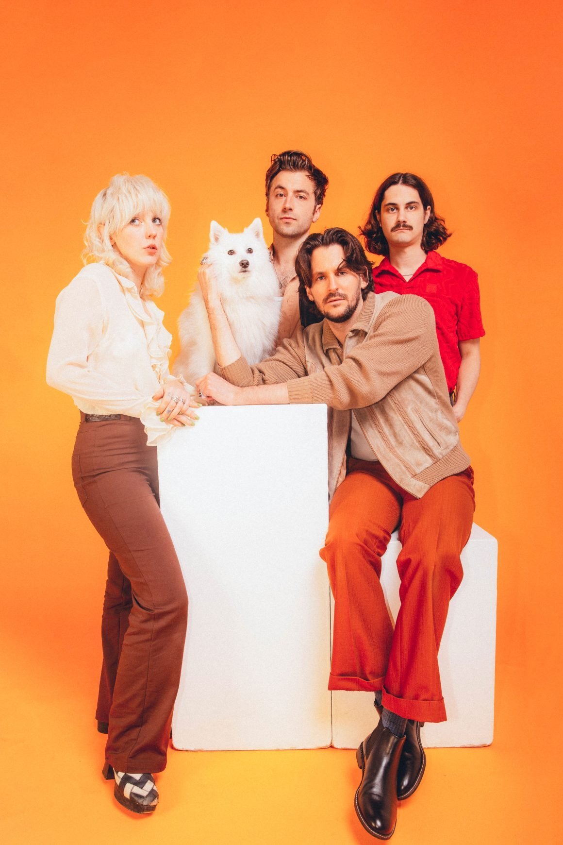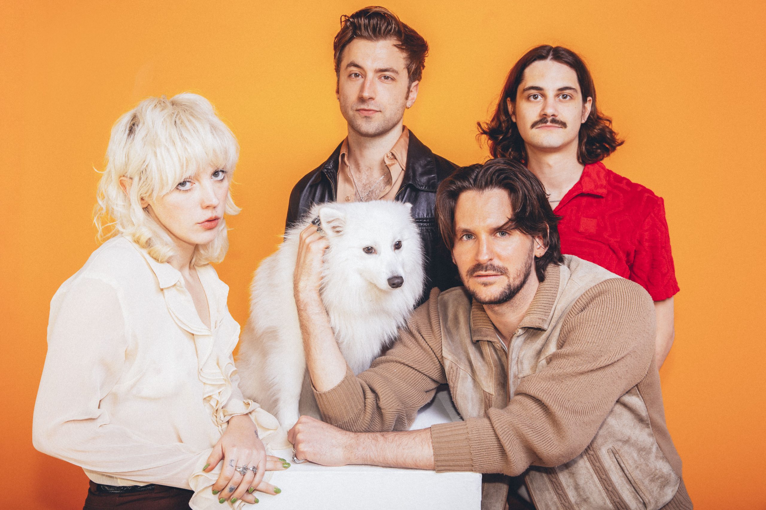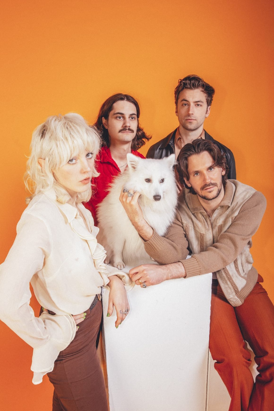 There’s an old saying about how stars, real stars, can light up a room as soon as they enter it; their personality and charm instantly shining from deep within them. That is most definitely the case today in a photo studio near Brixton, London, as the various members of Black Honey begin to drift in. Dressed head to paw in a beautiful, luxurious white coat and taking her place in front of the camera like she was born to do this, this is Zero the dog’s hour, and she will do whatever it takes to take the spotlight away from a band who are gunning for another chart success with their third album, ‘A Fistful Of Peaches’.