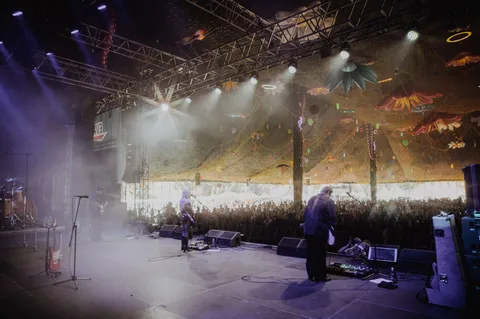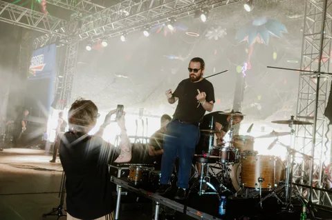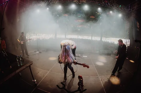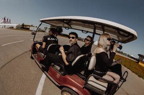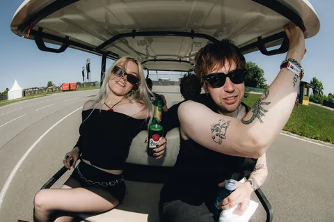 swim school taking a joyride on a buggy around an old Soviet airfield minutes before their set.
