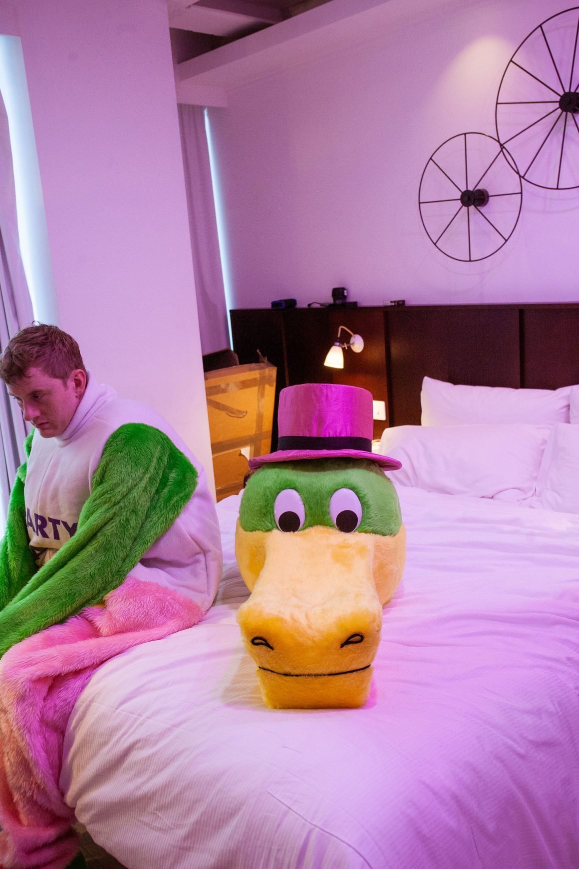 “I know what this project is and what it means to me, so I’m not too worried about the comedian-making-an-album syndrome. I knew that if I overthought it, then it would just ruin the project,” he continues. For a large part of the album’s creation, he was considering putting it out anonymously, hence the videos where he’s dressed up like a giant alligator with a career in starting parties. By the time the record was done, though, he knew it was all an important part of the story. “I know assumptions will happen, so I just have to hope the music speaks for itself.”