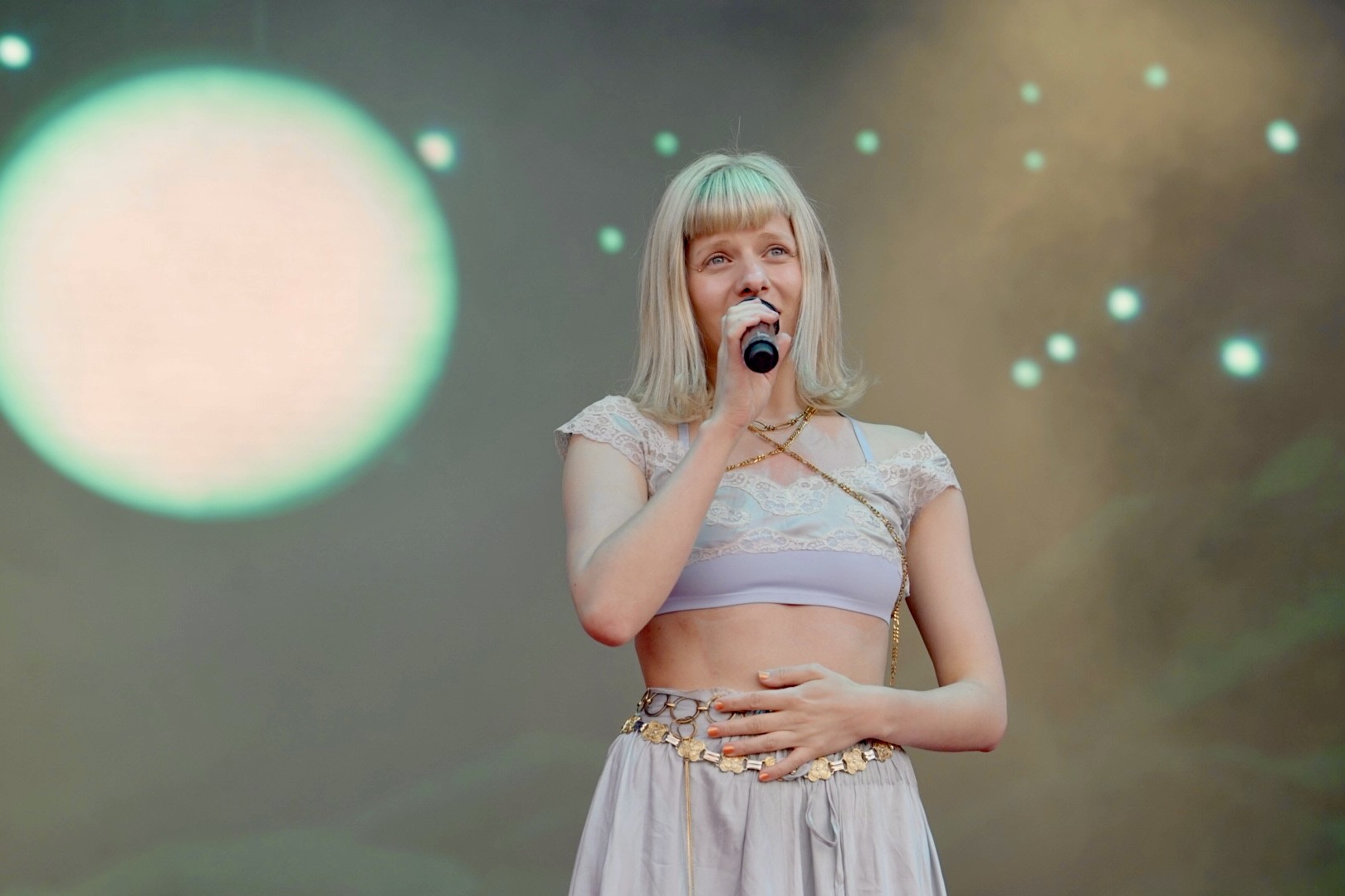 AURORA transforms the Park Stage into a realm of ethereal sounds and powerful messages - her barefoot performance a journey through her discography, each song carrying a weight of emotion and purpose beyond its melody.