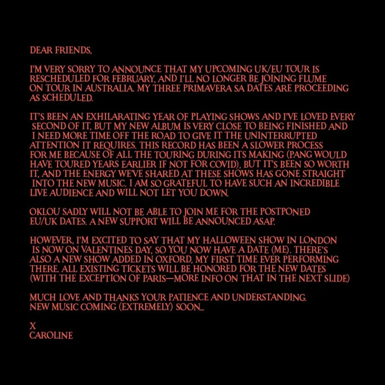 Caroline Polachek has announced that she is postponing her UK, EU and Australia tour dates, which were due to take place in the coming weeks.