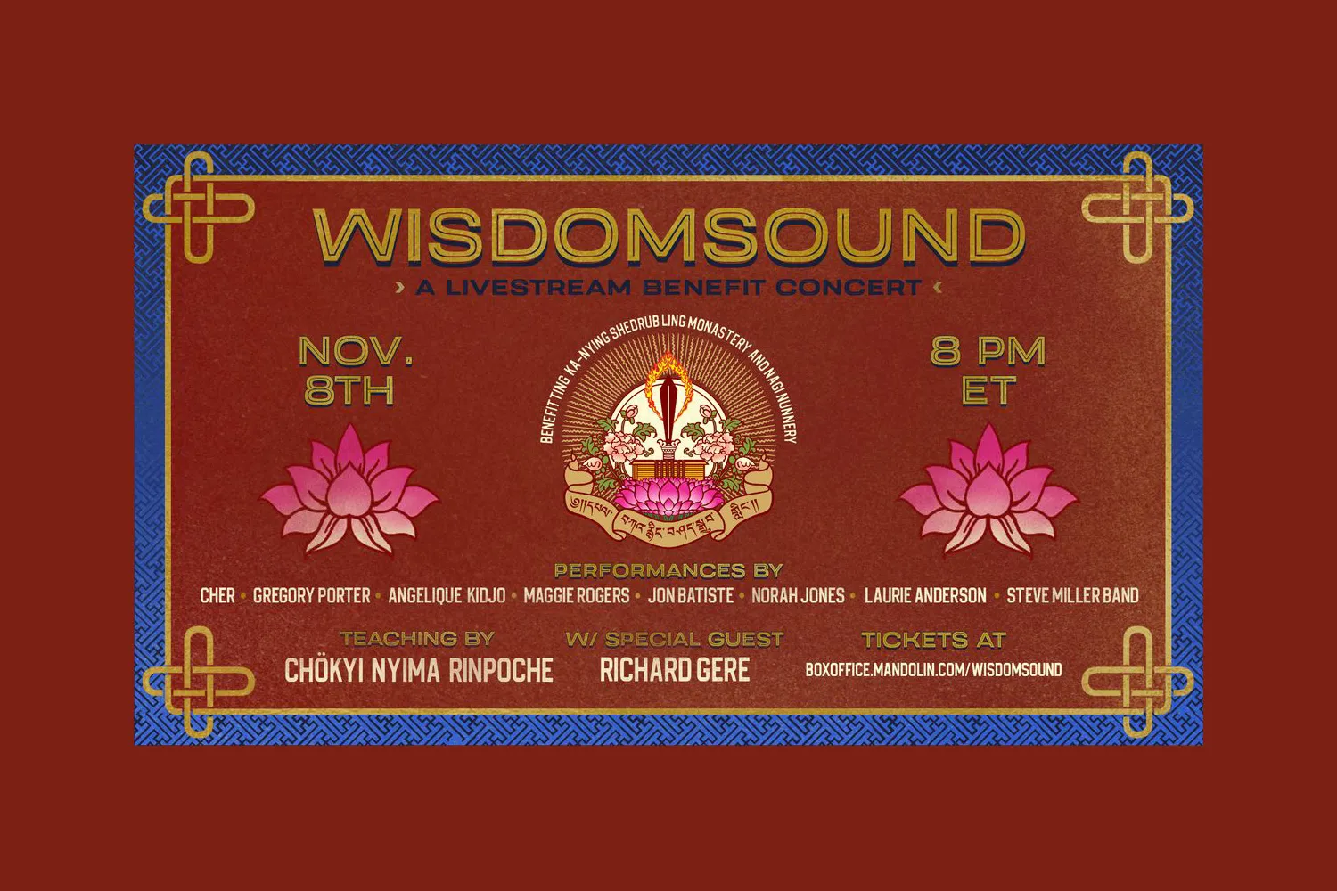 The event is in aid of Ka-Nying Shedrub Ling Monastery and Nagi Nunnery in Nepal, and also includes special guest Richard Gere and further appearances from Laurie Anderson, Jon Batiste, Norah Jones, Angelique Kidjo, Steve Miller Band, and Gregory Porter.