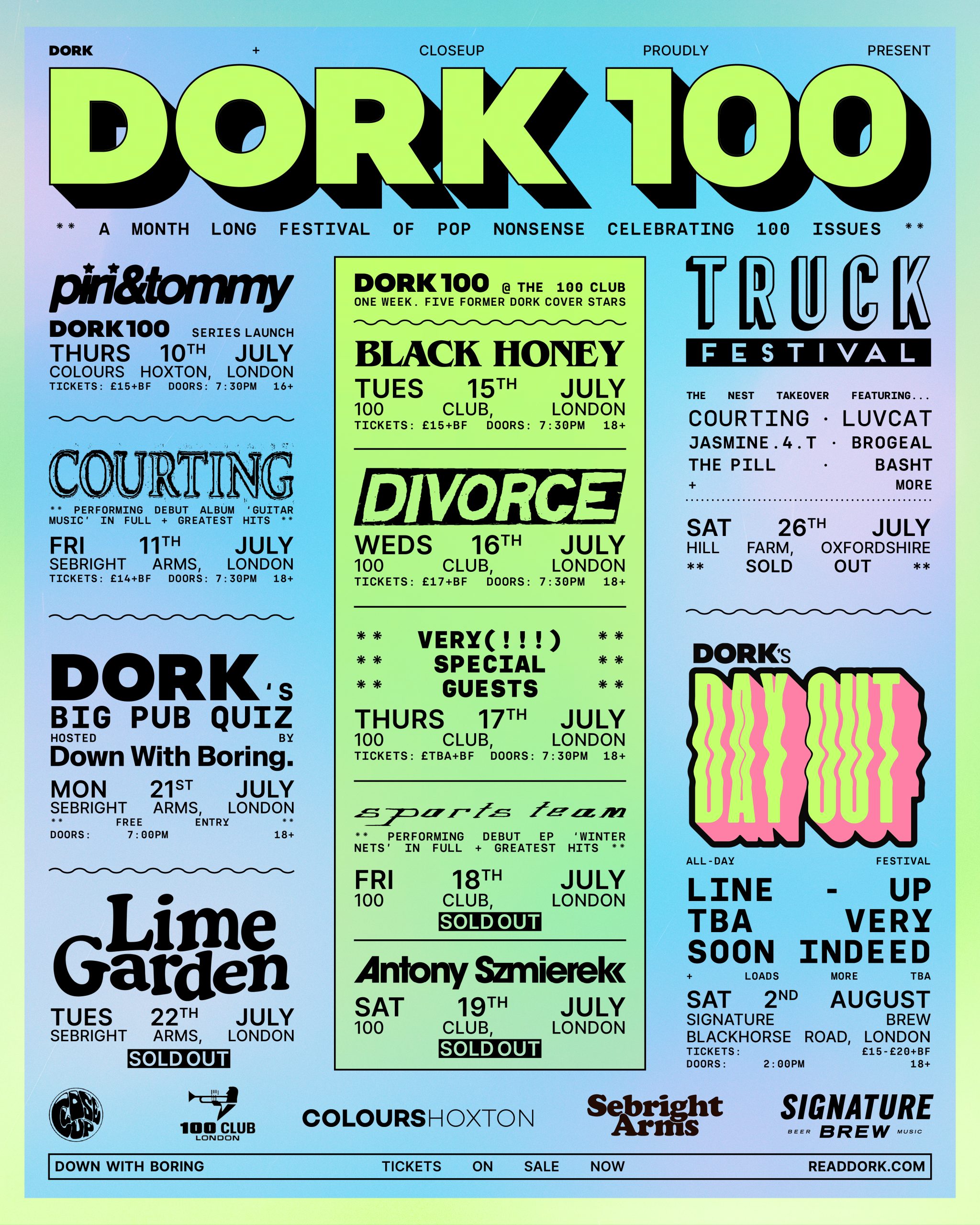 This summer, Dork turns 100 – and to celebrate, we’re throwing a month-long festival of shows, stages and general mischief under the Dork 100 banner. We’re kicking off on 10th July with piri & tommy at Colours Hoxton, then letting Courting loose at the Sebright Arms the next day for a run-through of their debut album 'Guitar Music' (plus ‘the hits’). After a short breather, we head to the iconic 100 Club for five nights of former cover stars, including Black Honey, Divorce, a VERY secret (and VERY famous) special guest, Sports Team playing 'Winter' Nets in full, and the ever-excellent Antony Szmierek. There’s also a pub quiz (obviously), a headline show from Lime Garden, and a full-scale festival takeover at Truck.