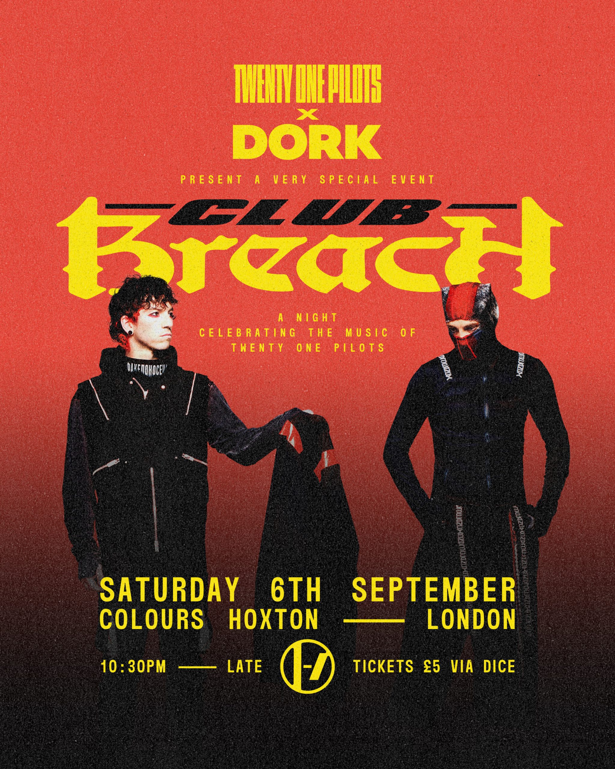 Club Breach is a one‑night, fans‑first blow‑out celebrating the music of Twenty One Pilots. Saturday 6th September, Colours Hoxton, London. 10:30pm ’til late. Tickets are £5 via DICE (order here). See you in the breach.