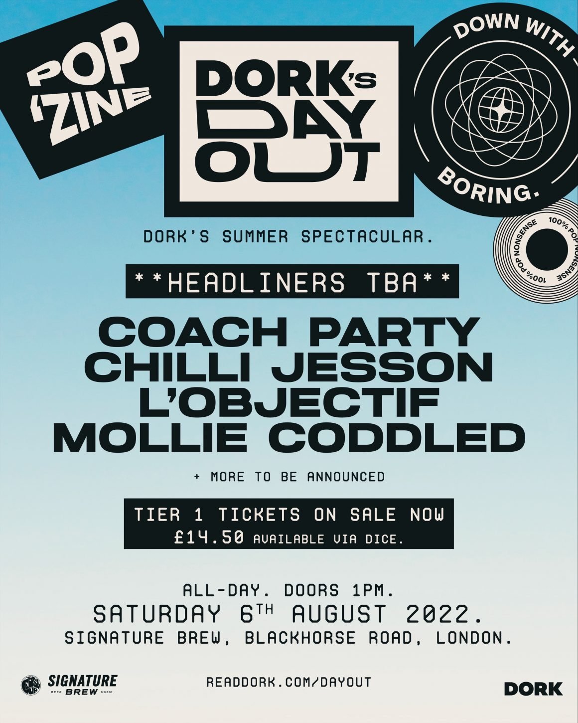 Coach Party, Chilli Jesson, L'objectif and Mollie Coddled are the first wave of acts joining the line-up for our one-day mini-festival Dork's Day Out.