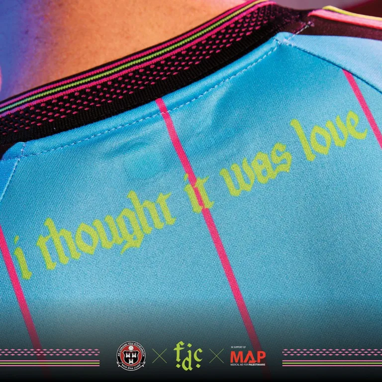 The collaboration between Ireland's oldest fan-owned football club and the Dublin-formed band sees guitarist Carlos O'Connell design the shirt alongside Bohemian FC's design team. The jersey pays homage to Fontaines D.C.'s album 'ROMANCE', featuring the album's colour scheme and including the quote "I thought it was love" around the neck. An embroidered hem tag displays a Palestinian flag with the words 'Saoirse don Phalaistín' (Free Palestine).