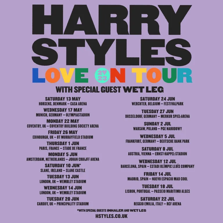 Harry Styles is currently on tour in the US, but will return for a slate of UK & EU shows next summer, with special guests Wet Leg - tickets are available here.