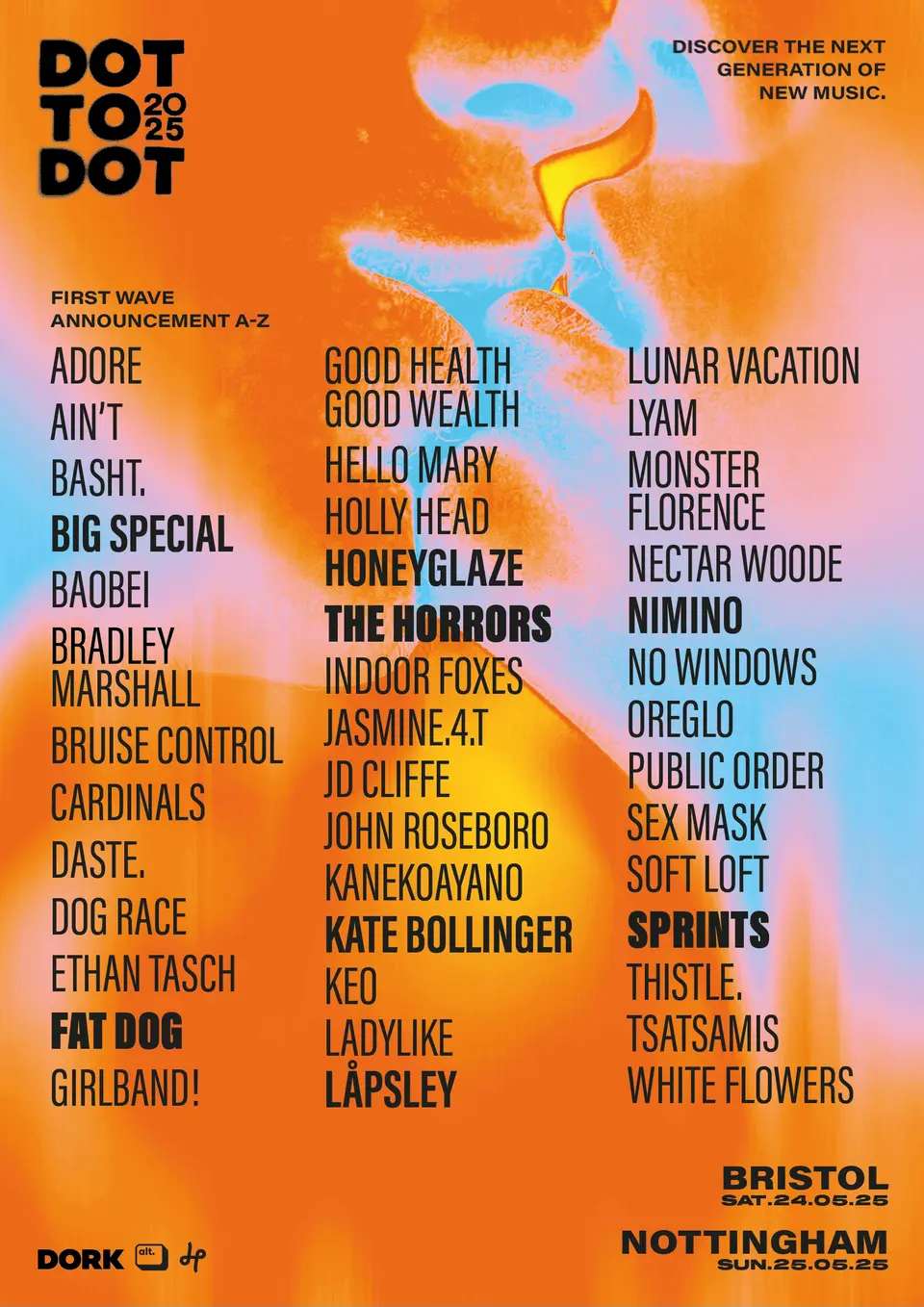 The lineup also includes Adore, Ain't, Baobei, Basht, Bradley Marshall, Bruise Control, Cardinals, Daste, Dog Race, Ethan Tasch, Girlband!, Good Health Good Wealth, Hello Mary, Holly Head, Indoor Foxes, Jasmine.4.t, JD Cliffe, John Roseboro, Kanekoayano, Keo, Ladylike, Lunar Vacation, Lyam, Monster Florence, Nectar Woode, Nimino, No Windows, Oreglo, Public Order, Sex Mask, Soft Loft, Thistle, Tsatsamis, and White Flowers.