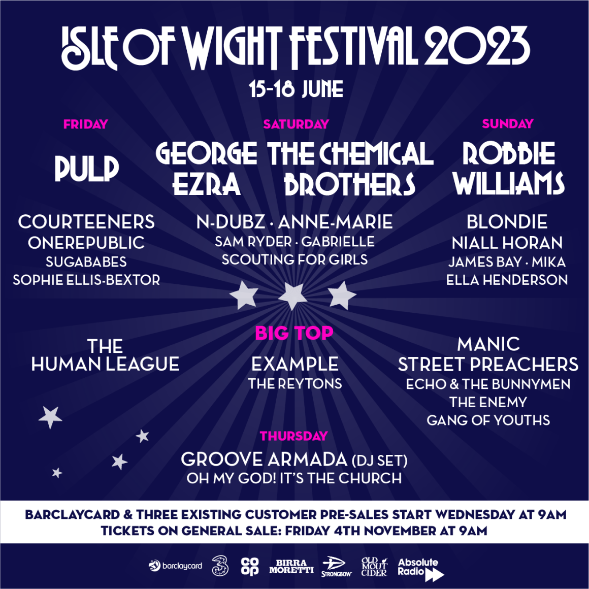 George Ezra, Pulp, Robbie Williams, and The Chemical Brothers lead the first line-up announcement for Isle of Wight Festival 2023.