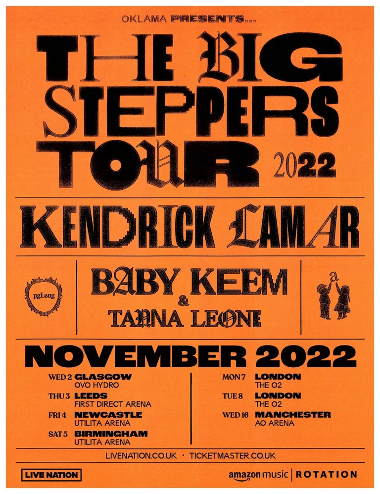 joined by Baby Keem and Tanna Leone, Kendrick will support his just dropped new album 'Mr. Morale & The Big Steppers' with a worldwide run that kicks off in July.
