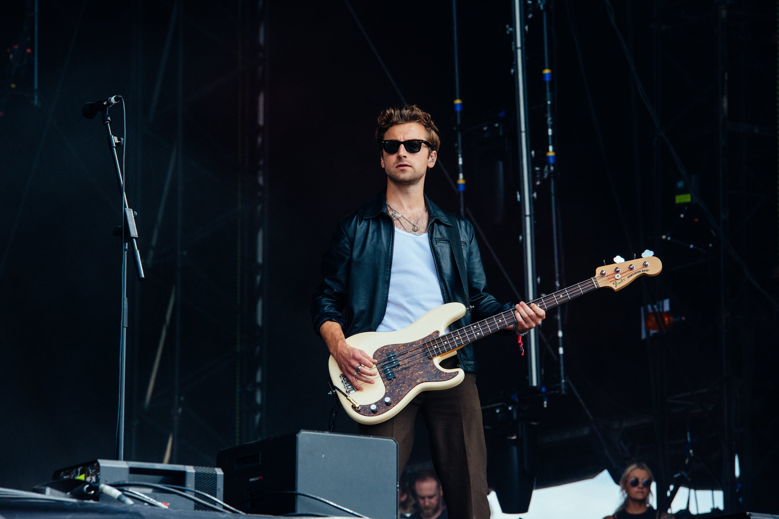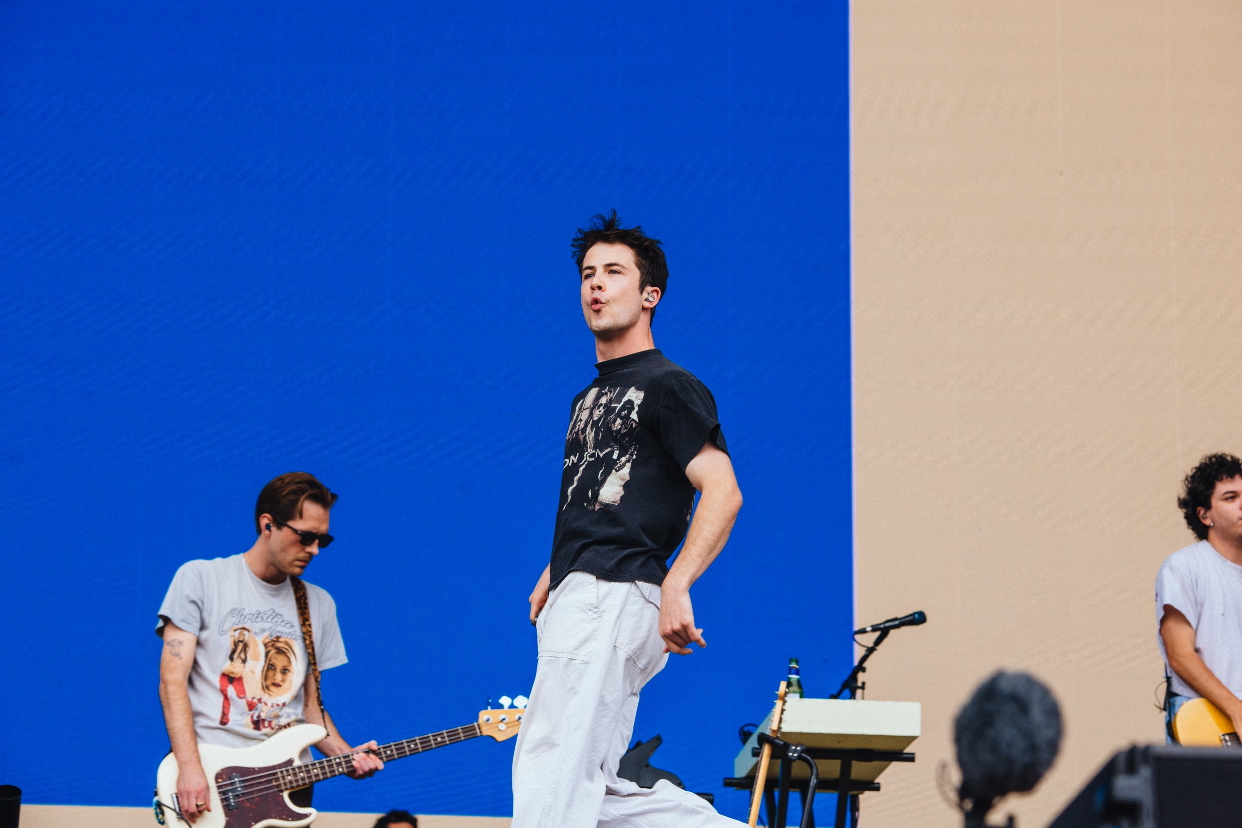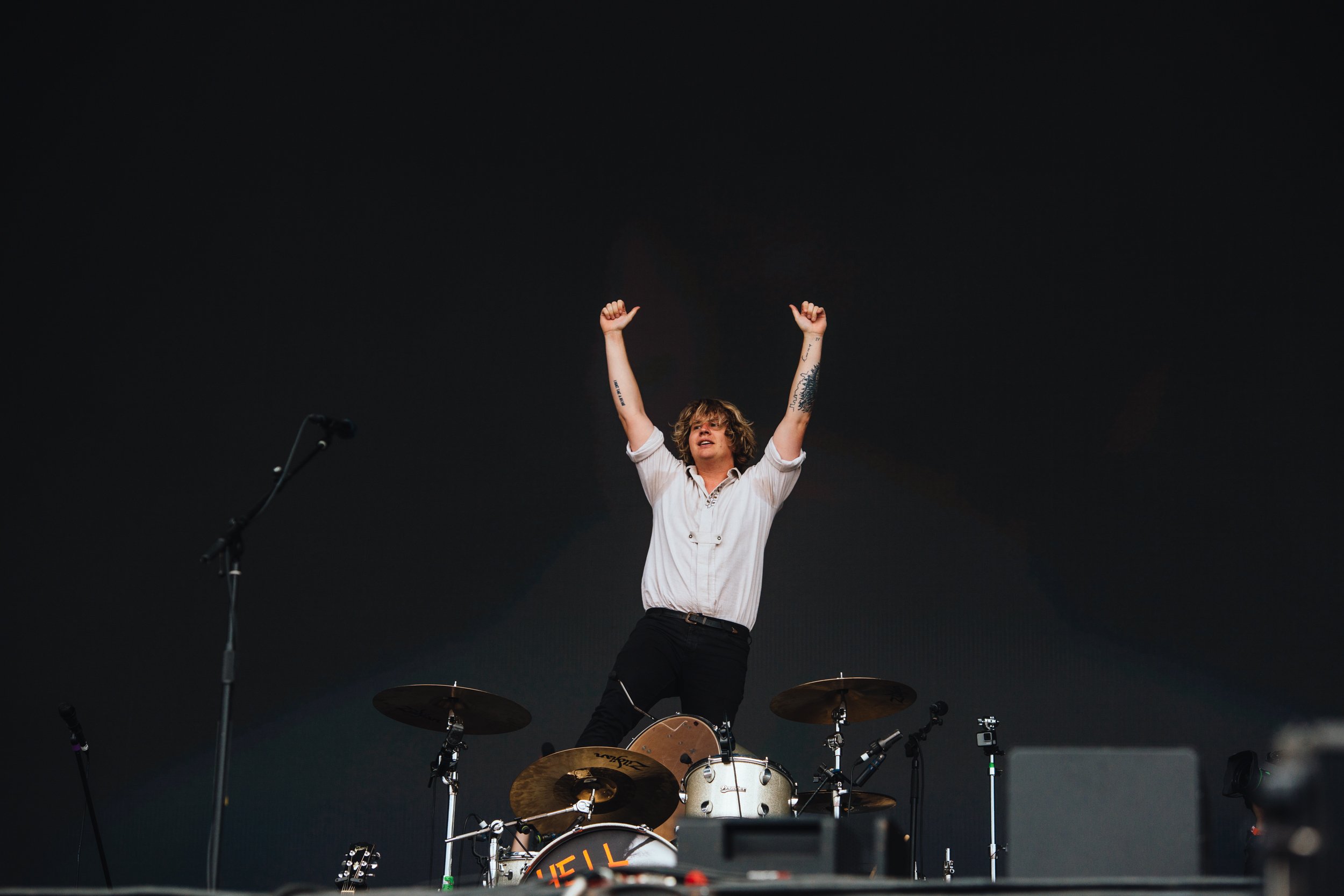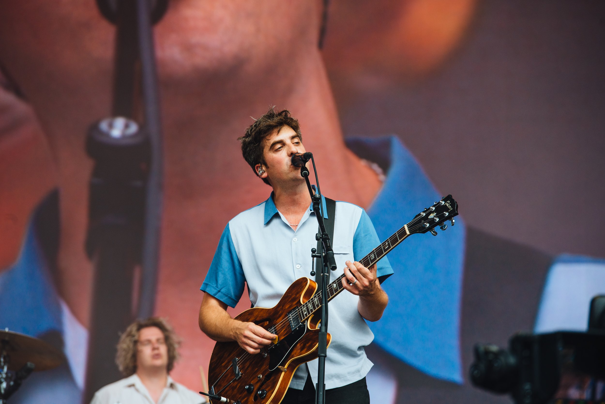 LA charmers Wallows bring their luxuriously lo-fi indie pop vibes across the pond, shifting their show from the likes of Lollapalooza and Coachella to the slightly soggy fields of England. Fortunately, their laidback energy isn't lost on the crowd, who turn near feral as soon as the Indiana Jones theme backs the trio's entrance. Opening with 'I Don't Want To Talk', a cut from March's 'Tell Me That It's Over', Dylan Minnette's lead vocals start off rough but quickly shake off the jet leg - a delightful turn on the harmonica seems to help. When Braeden Lemasters joins him with harmonic backing, their charm is irresistible.