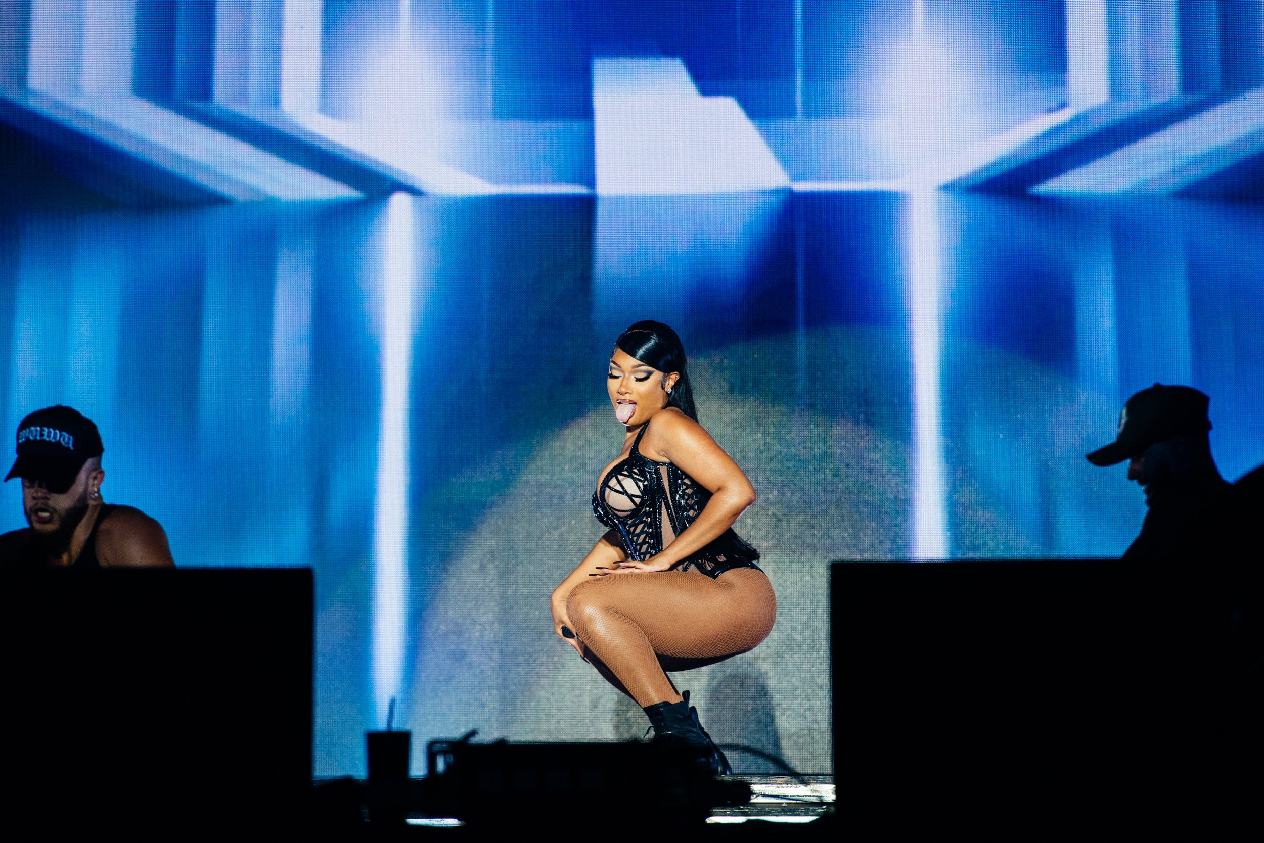 Speaking of, she keeps asking the audience if there’s any ‘hotties’ here - “OG Hotties” for ‘Tina Snow’ tracks, “2019 Hotties” for ‘Fever’ tracks, “real hot girls” for everything else - and calls out a fan hoisting up a “BRING ME ON STAGE FOR CAPTAIN HOOK” banner. Unfortunately, security stops it happening in time, but eight fans make it on stage for ‘Cash Shit’, all twerking as expertly as they can in Megan’s honour.