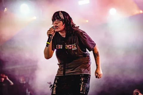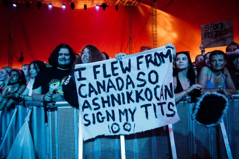 Their fans know it too. Girls in the front row are holding up “sign my tits” banners (including one fan who’d apparently flown from Canada on the off chance they would), and going absolutely feral when Ashnikko instructs them to have a therapeutic scream.