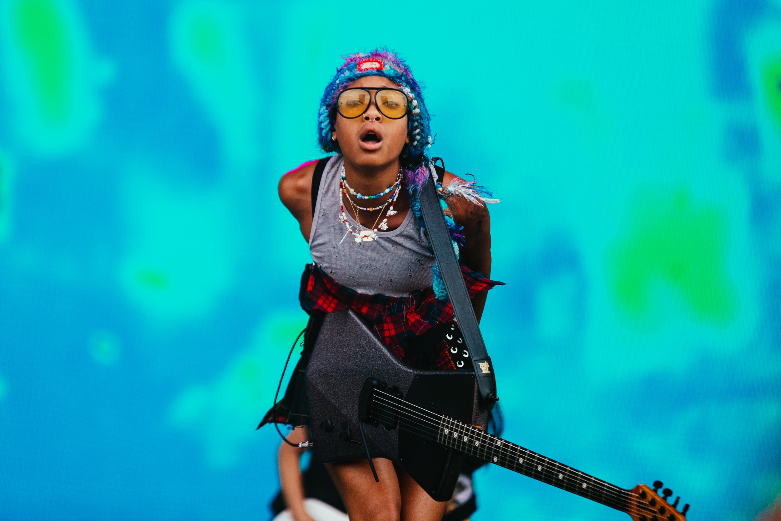 Bringing a much needed lease of positivity to a Sunday Main Stage East crowd is Willow. One of the more unlikely breakout rock stars of the new pop punk wave, she opens with the reintroduction single ‘Transparent Soul’, a bunny-eared beanie covering her usually shaved head to flip around in lieu of hair.