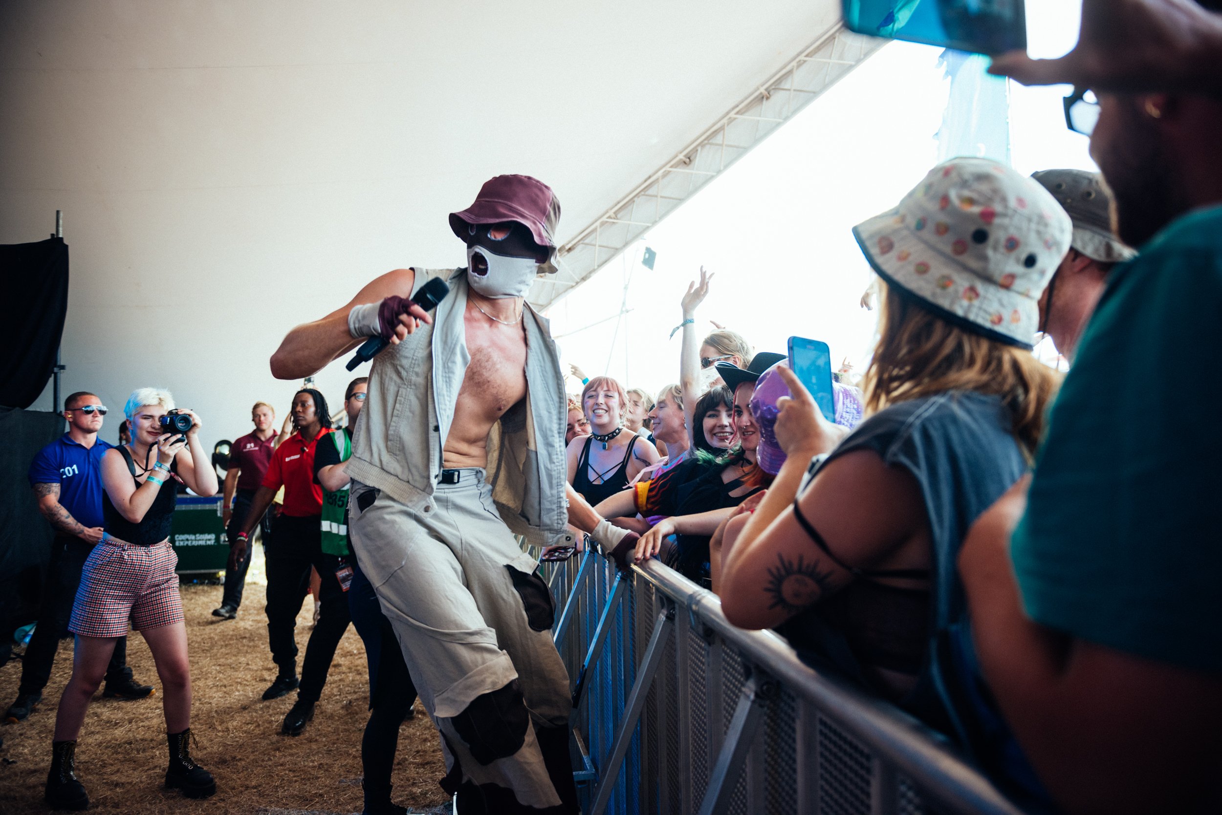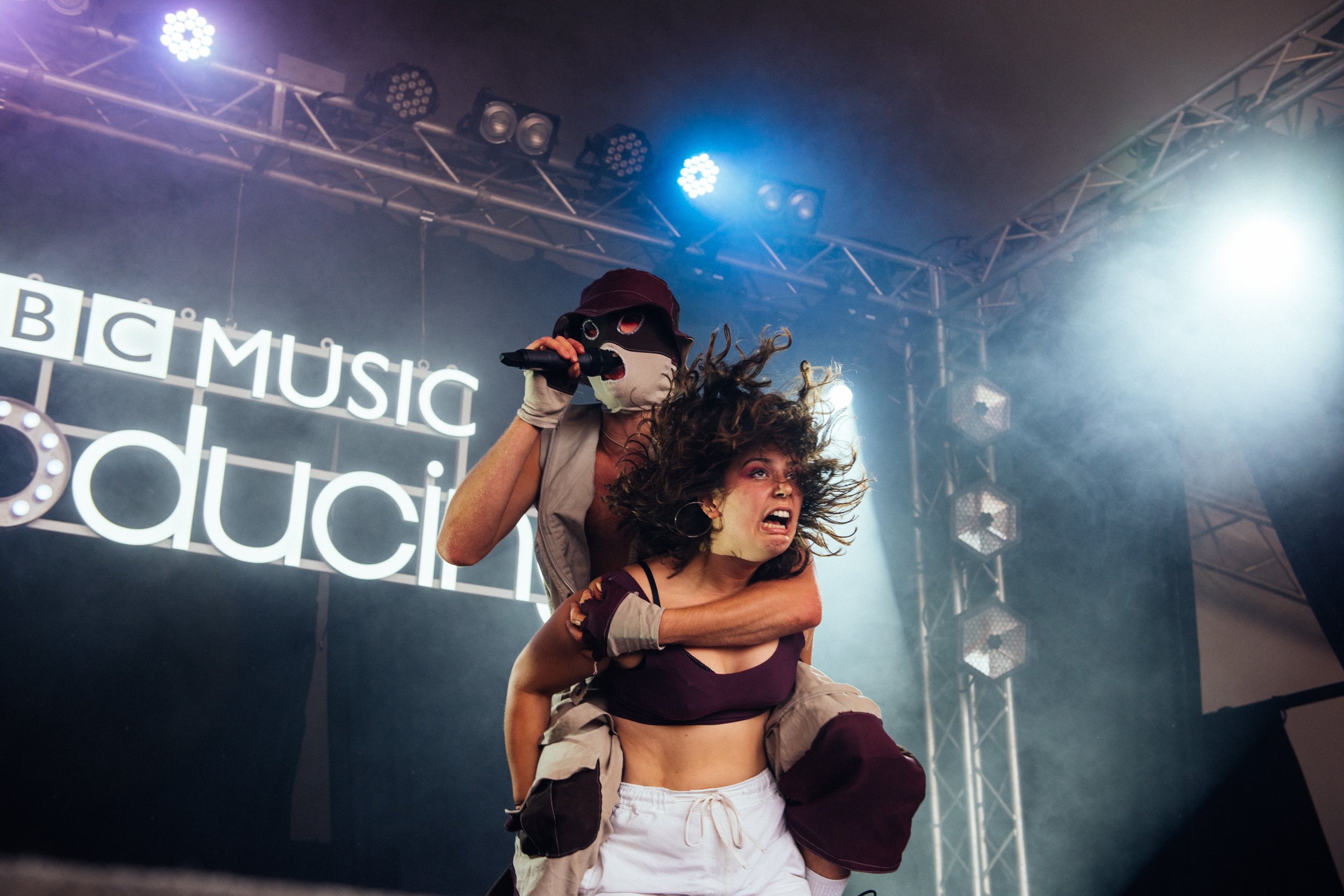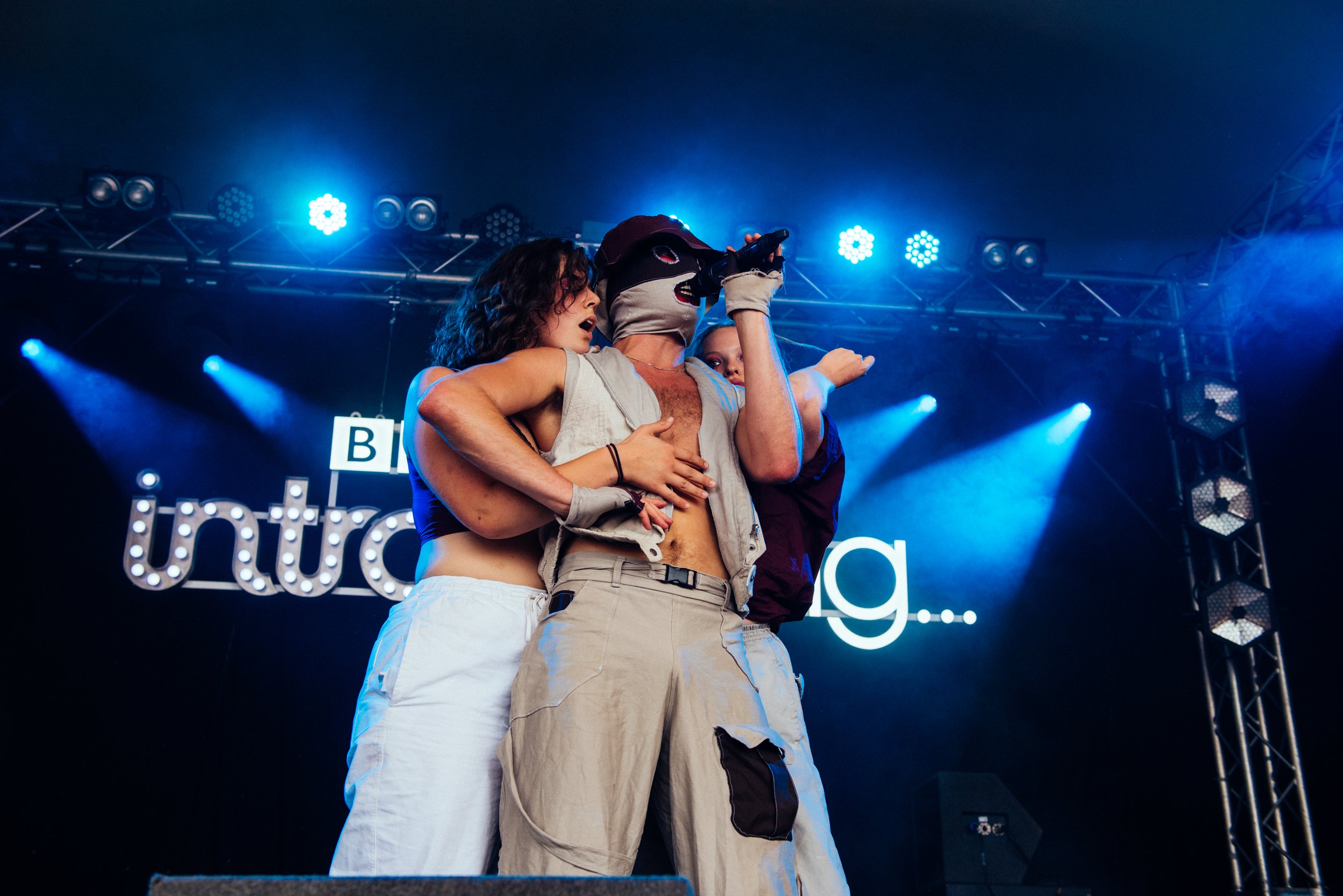 Lynks pops up at the BBC Introducing stage for a secret set, one self-labelled as "the legends slot." After a bizarre start with HERE COMES THE BRIDE, they jump on stage alongside their 'shower gel girls' and right into a heavily choreographed show that demands listeners supply dance moves of their own. The level of physicality is impressive, particularly as the masked singer jumps into the pit during 'Straight Acting', and that's only song number two. An extremely explicit undertaking spices up even the already-too-hot Sunday glare, and Lynks admits, "I shouldn't have worn a gimp mask today." Revealing unreleased material ('Use It Or Lose It'), they encourage fans to grasp their prime years while they can, and this audience quickly obeys. Revelling the chaos of this notorious festival, Lynks, as usual, offers horny queer bangers galore. (FH)