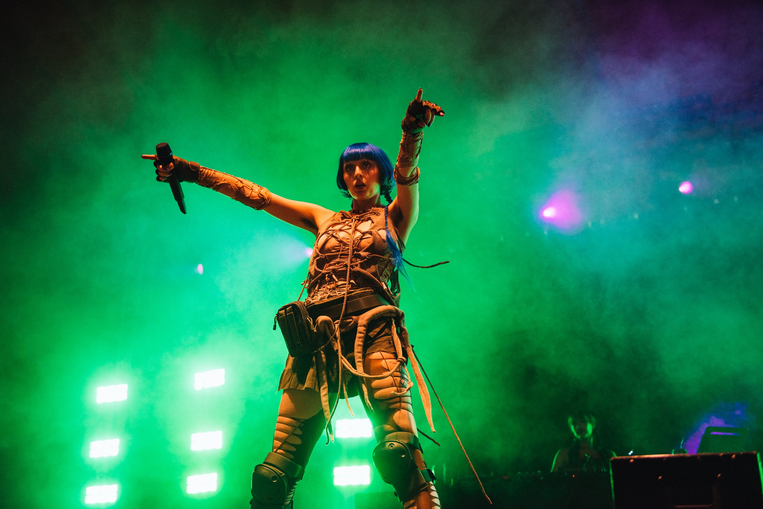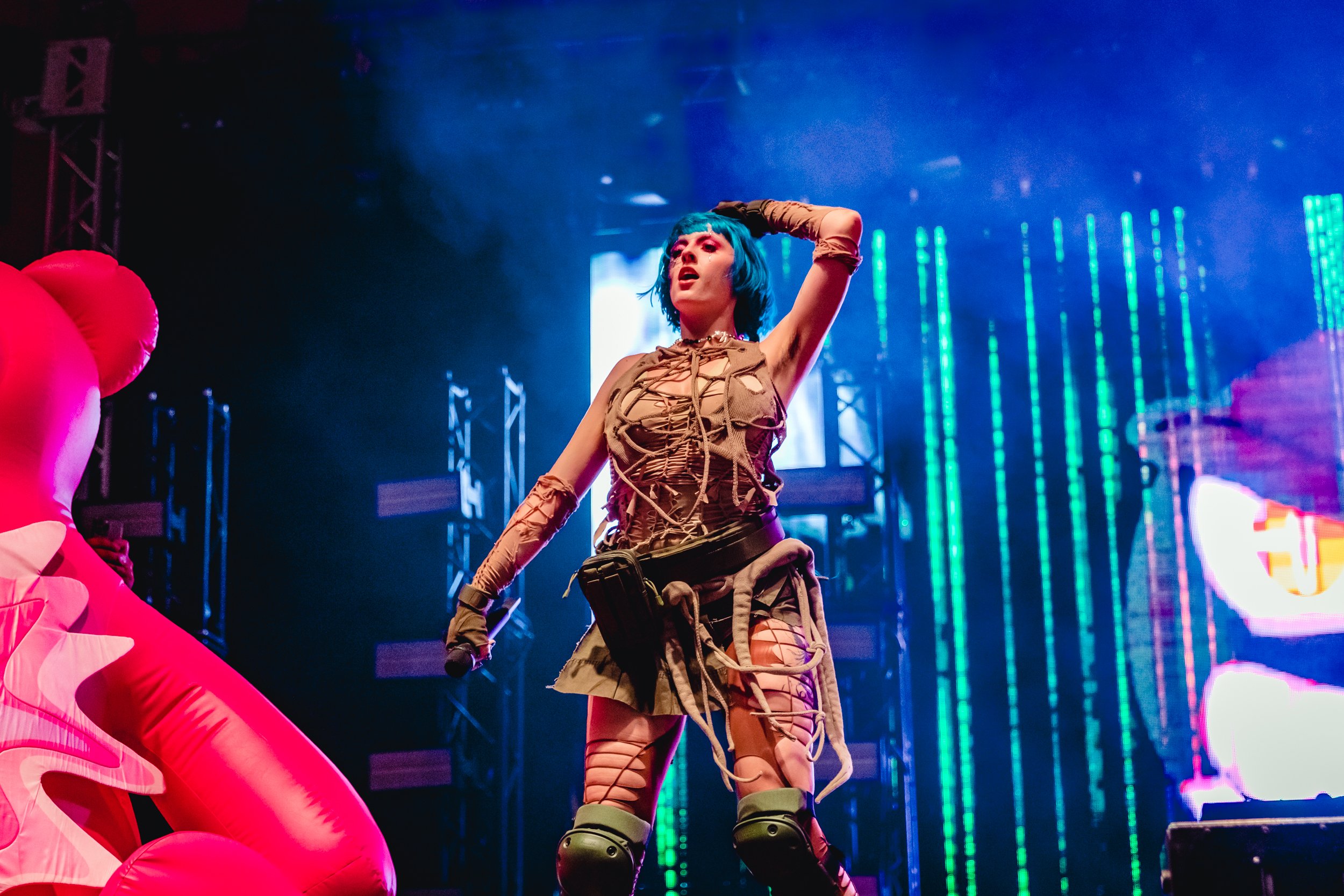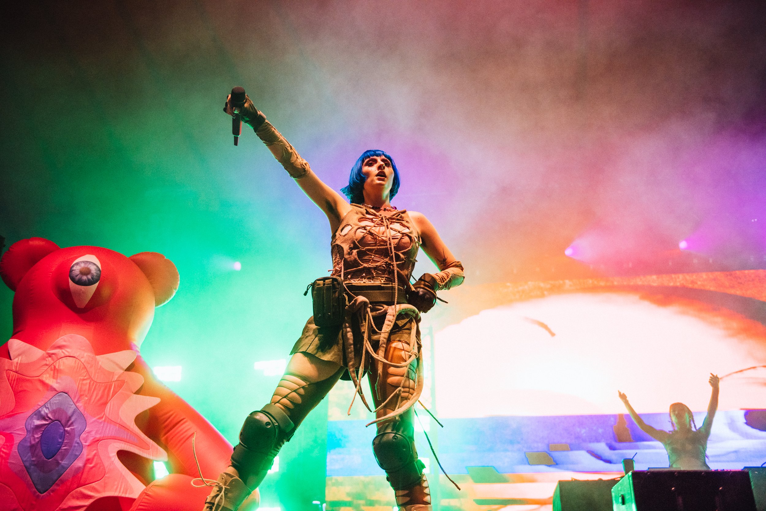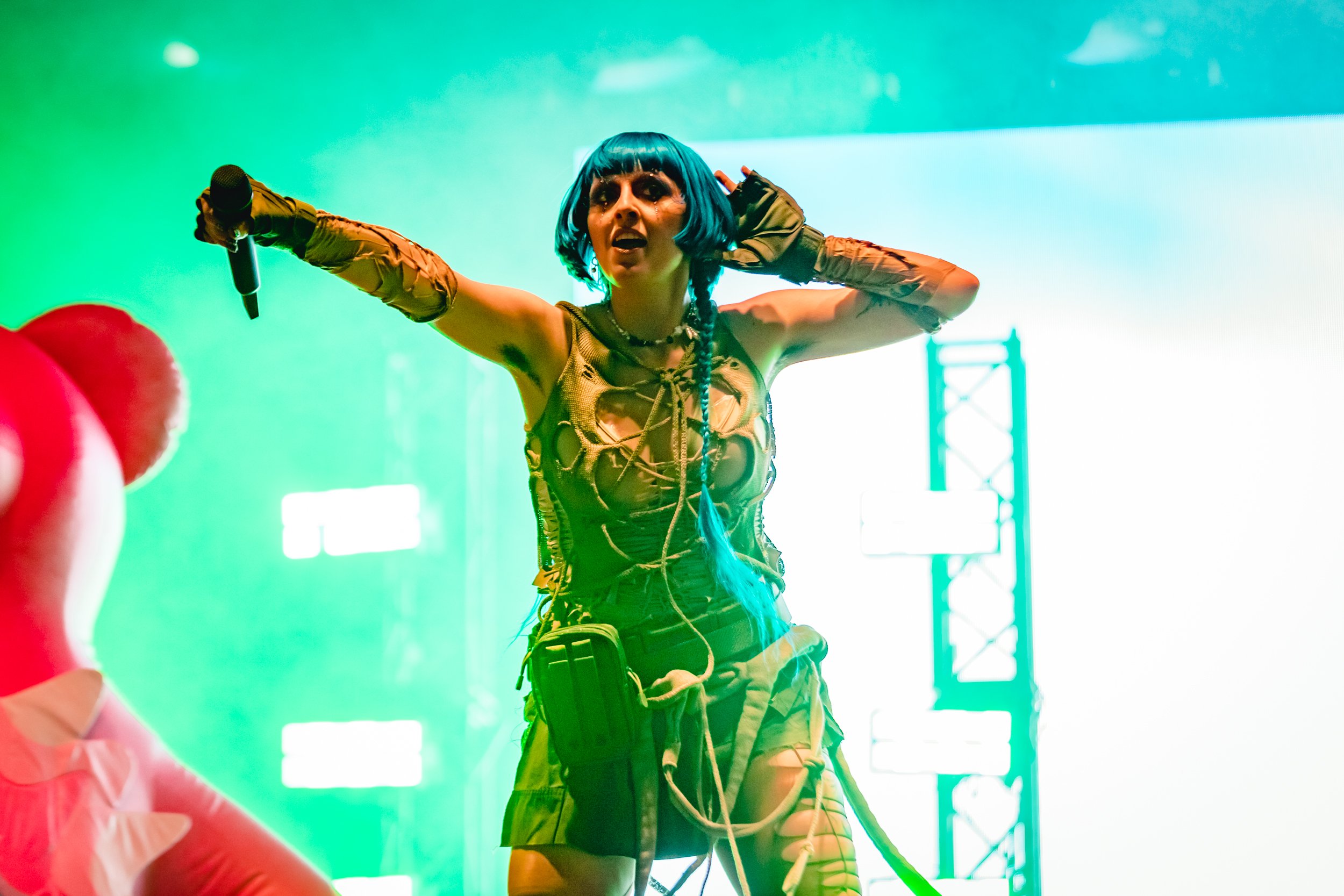 Following up 100 gecs is hard to beat on the bonkers scale, but Ashnikko gives it a good go. Dressed in little other than ropes wrapped around her body and humping the stage in front of two hot pink teddies with huge vulvas printed on them, her stage show is just as provocative as her lyrics.