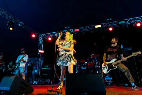 “It’s a dream to be standing here, with my best friends,” starts Kat, taking a break from churning the crowd up to share a sincere moment of gratitude. “I don’t know who came here today to break a sweat and do some dancing but ‘Psychic Dance Routine’ is your chance,” she continues. The title track to the band’s latest EP sees Scowl dial into the melody that’s always been a vital part of their sound, and push it through a fearless, colourful filter. It doesn’t mean that the circle pits are any less intense, only that the people who really have no idea who Scowl are have something to latch onto. And it isn’t long before some of them are in the middle of the circle pit, either.