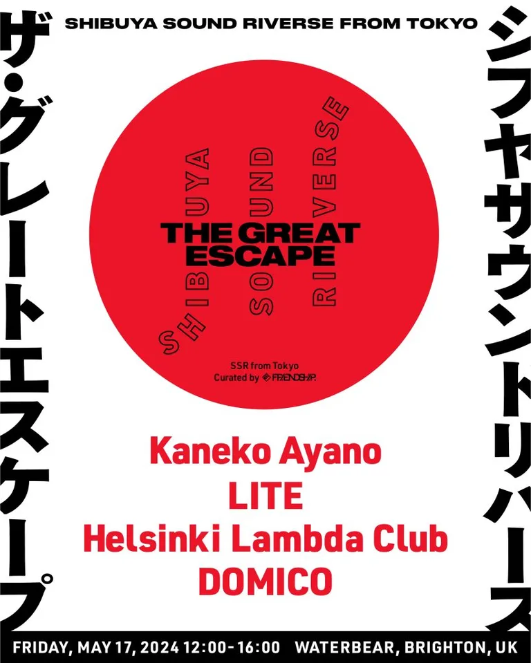 Kazuto Yamazaki founder of FRIENDSHIP. says: "One of our primary goals at FRIENDSHIP. has always been to amplify the voices of independent Japanese artists on a global scale. Our festival SSR (Shibuya Sound Riverse) started in 2022 and we set out to do just that. While our first two editions took place in Tokyo's vibrant Shibuya district, our upcoming showcase at 'The Great Escape 2024' marks an exciting shift. We are extremely honoured to be debuting our Tokyo showcase at this amazing festival in Brighton, UK and we aim to elevate the visibility of Japanese talents to new heights."