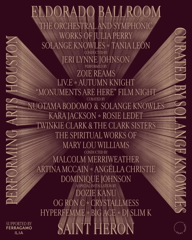 "We're thrilled to work with Solange and Saint Heron to present her vision right here in her hometown," says Performing Arts Houston President & CEO Meg Booth. "Collaborating with Solange, Saint Heron, and Project Row Houses to shine a light on the Eldorado's legacy of inspiring Black creativity and community with so many great artists is an enormous honor."