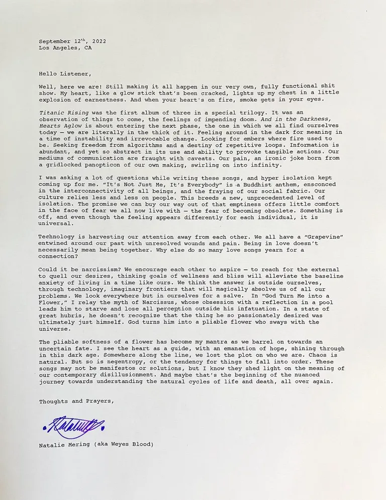 “We’re in a fully functional shit show,” Weyes Blood - aka Natalie Mering - explains. “My heart is a glow stick that’s been cracked, lighting up my chest in an explosion of earnestness.”