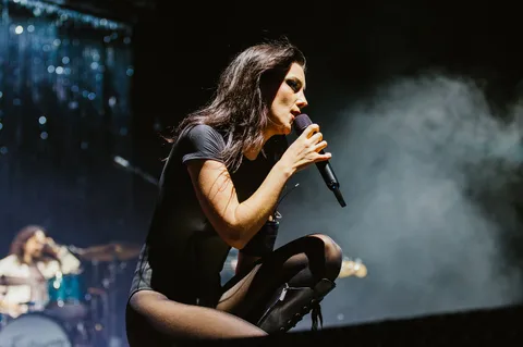 There’s a stripped-back ‘Safe From Heartbreak’ that sees the band huddled together at the very front of the stage before that intimacy is transformed into a venue-wide dose of scream therapy. ‘Yuk Foo’ is a wailing beast that has Ellie yelling down a megaphone and spinning around on a giant turntable while the dreamy fairytale theatrics of ‘Silk’ prove the band has always been more than a grungy rock mob. Though they’re great at that too, with the reliable carnage of ‘Giant Peach’, the snarling stadium anthem ‘Play The Greatest Hits’, and the surprisingly rowdy ‘How Can I Make It Ok?’ causing boisterous chaos throughout the room. You want danger? Ellie stacks it during ‘Formidable Cool’, which is as perfect a time as any for her first onstage trip.