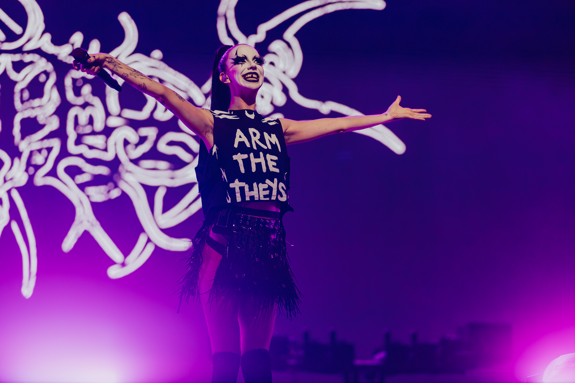 And what better way to start than Bambie Thug? Following their brilliant showing at last year’s Eurovision, their Ouija pop has been finding its way to more and more people. Snarling revenge anthem ‘Hex So Heavy’ and the chirping rave of ‘Last Summer (I Know What You Did)’ sound phenomenal in an arena, while ‘Careless’ is a tender break from the hectic, EDM fuelled breakdowns. Politically charged new song ‘REDRUM RAVE’’ is heaps of cathartic fun. Backed by the Trans Pride and Palestinian flags, Bambie explains that it’s a song for rebellion and encourages the crowd to “use their voice” whenever they can. Bambie has certainly found theirs.