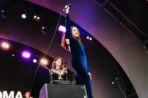 Taking to the Rainbow Stage, Let’s Eat Grandma continue their evolution into absolute superstars, without losing their fiery sense of individuality. Opener Happy New Year is a giddy triumph of camaraderie while both ‘Levitation’ and ‘Hall Of Mirrors’ pull LEG’s playful spirit into a fierce focus. Their instrument-swapping, hand-clapping, dancing performance has a joyful anarchy to it while ‘Hot Pink’ and set closer ‘Donnie Darko’ craft euphoria from fury.