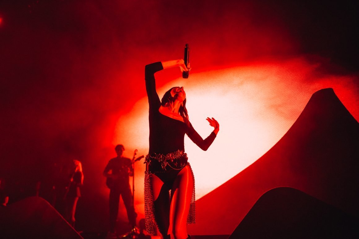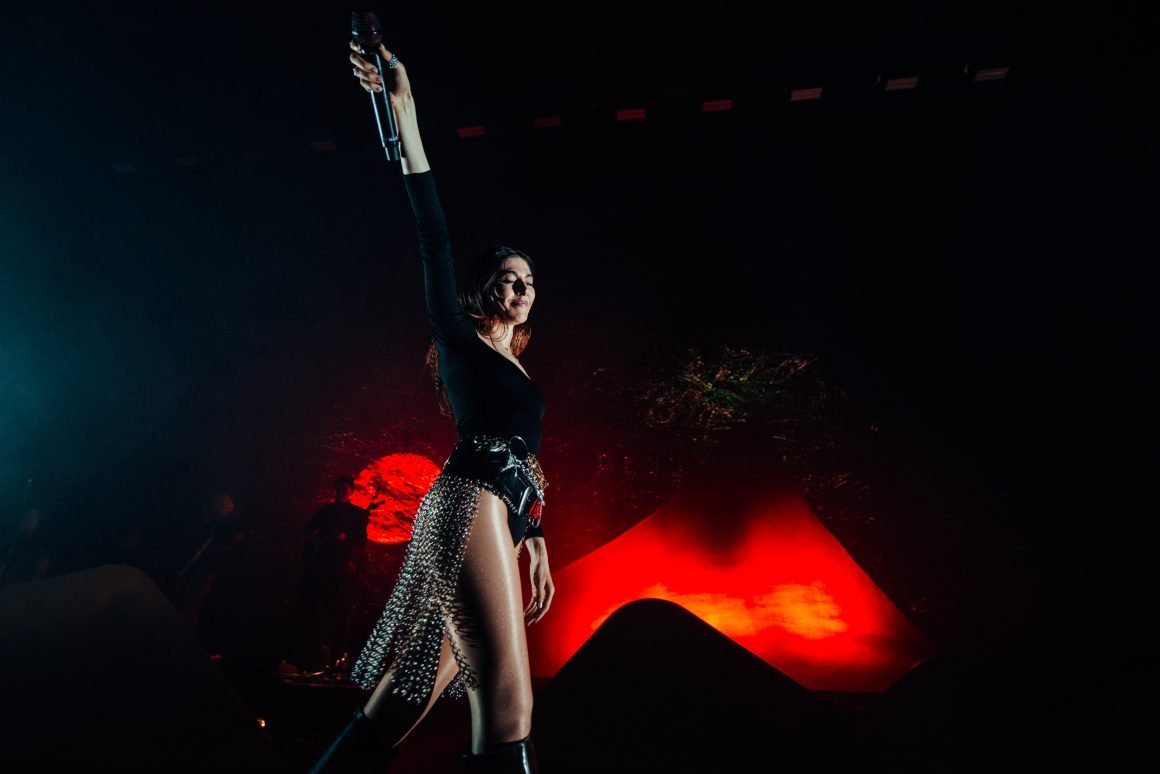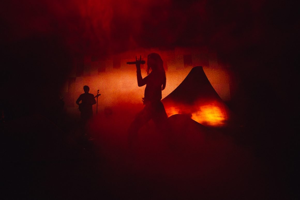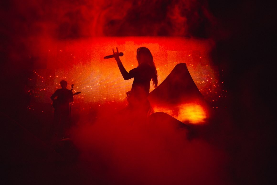 Playing ‘Desire, I Want To Turn Into You’ almost entirely in order, interjected by the odd ‘Pang’ track, by the time she gets to the record’s first single ‘Bunny Is A Rider’ fourth, she’s fully hit her stride. Its bouncy and carefree, making the transition into ‘Crude Drawing of an Angel’ all the more contrasting. It’s a dark show as it is, Caroline often only lit by a single spotlight and backed by the changing landscape projected behind her and the giant volcano she shares the stage with, but on this one, she’s lit by footage of burning crosses in an Ethel Cain-ish religious nod to the track’s themes. An eerie moment that almost immediately lifts as she goes into a run of ‘Ocean of Tears’, ‘I Believe’ and ‘Fly To You’.
