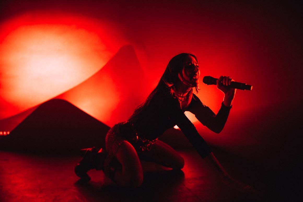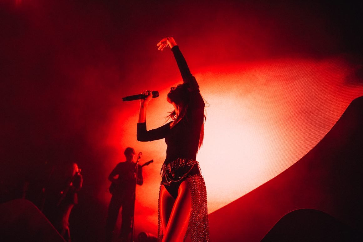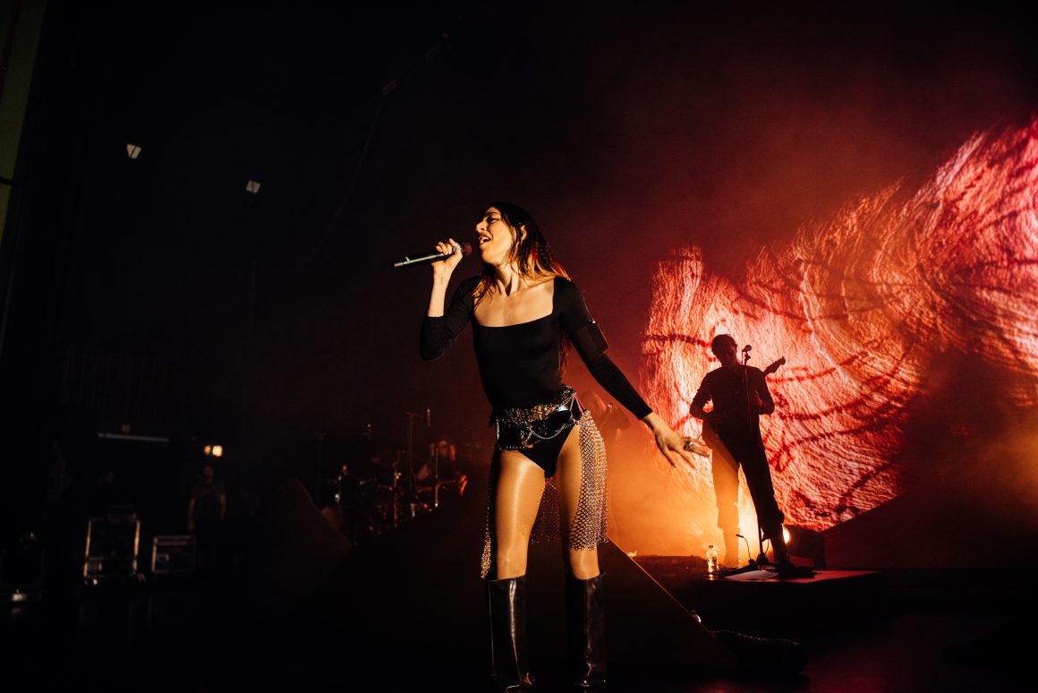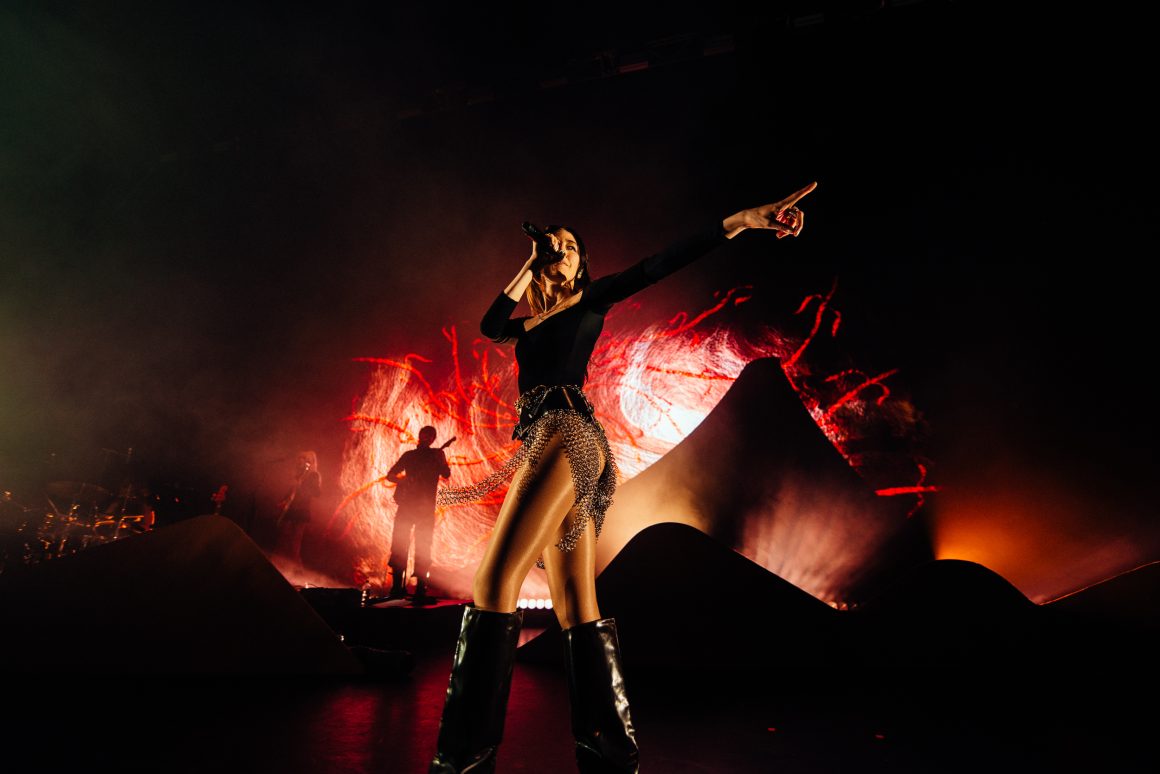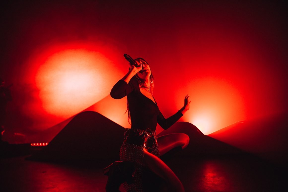 Playing ‘Desire, I Want To Turn Into You’ almost entirely in order, interjected by the odd ‘Pang’ track, by the time she gets to the record’s first single ‘Bunny Is A Rider’ fourth, she’s fully hit her stride. Its bouncy and carefree, making the transition into ‘Crude Drawing of an Angel’ all the more contrasting. It’s a dark show as it is, Caroline often only lit by a single spotlight and backed by the changing landscape projected behind her and the giant volcano she shares the stage with, but on this one, she’s lit by footage of burning crosses in an Ethel Cain-ish religious nod to the track’s themes. An eerie moment that almost immediately lifts as she goes into a run of ‘Ocean of Tears’, ‘I Believe’ and ‘Fly To You’.