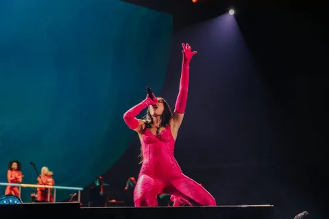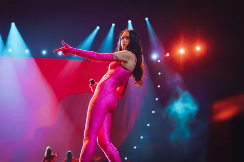 Despite all the polish, Dua's personality shines through every aspect of this show. She waves a pride flag during the swaying 'Cold Heart', covers the crowd in glitter for 'Levitating' (which looks amazing, but hopefully no one has an important business meeting in the morning) and performs in front of a giant lobster for the swaying 'We're Good'. After dominating her support slot, Angèle returns to the stage for 'Fever', and the two look like they're genuinely having the most fun. That glee is infectious.