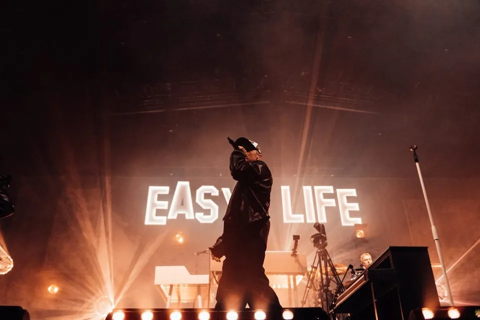Halfway through Easy Life's headline party at London's Alexandra Palace, a phone goes off. It stops the show, and rings bounce around the venue as Murray picks up to see who it is. It's an invite to an afters, and let's just say he's busy. "Nah mate, I can't; I'm on stage at Ally Pally right now," he replies. Moments later, there's another ring, asking if that is indeed true. Next, they're buzzed in, and Easy Life's triumphant night continues. It captures the feeling that runs through every moment of this Saturday night in London for a band who've captured a modern generation like few others.