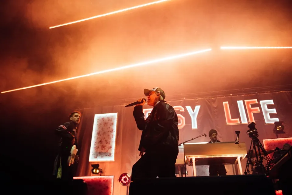 From the first drop of 'GROWING PAINS', Easy Life embrace that feeling of a big-time show but voiced through their own speakerphone. Decked in uniform leather jackets and a dazzling production to boot, frontman Murray is a ball of energy. The lush vigour of 'daydreams' and the singalong refrain of 'sangria' set a joyous mood; few shows come close to the sheer fun and happiness that Easy Life bring. It's dialled up to ridiculous levels, whether it's the sweeping pop gleams of 'OTT' (which sees a fan join the band to play guitar in its spinning outro), the pounding electro breakdowns of 'BASEMENT' (which live, becomes an unstoppable wave of scorching beats and the throwdowns) or the drowned out calls of early number 'slow motion'.