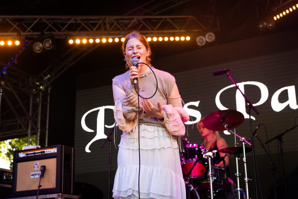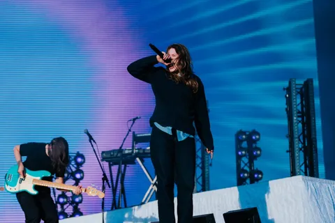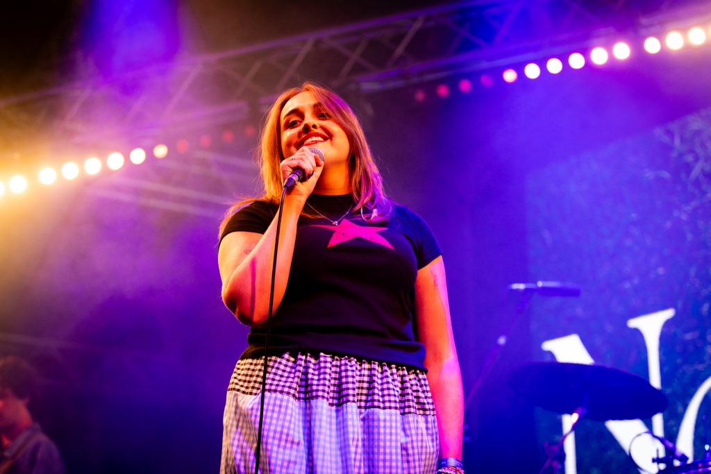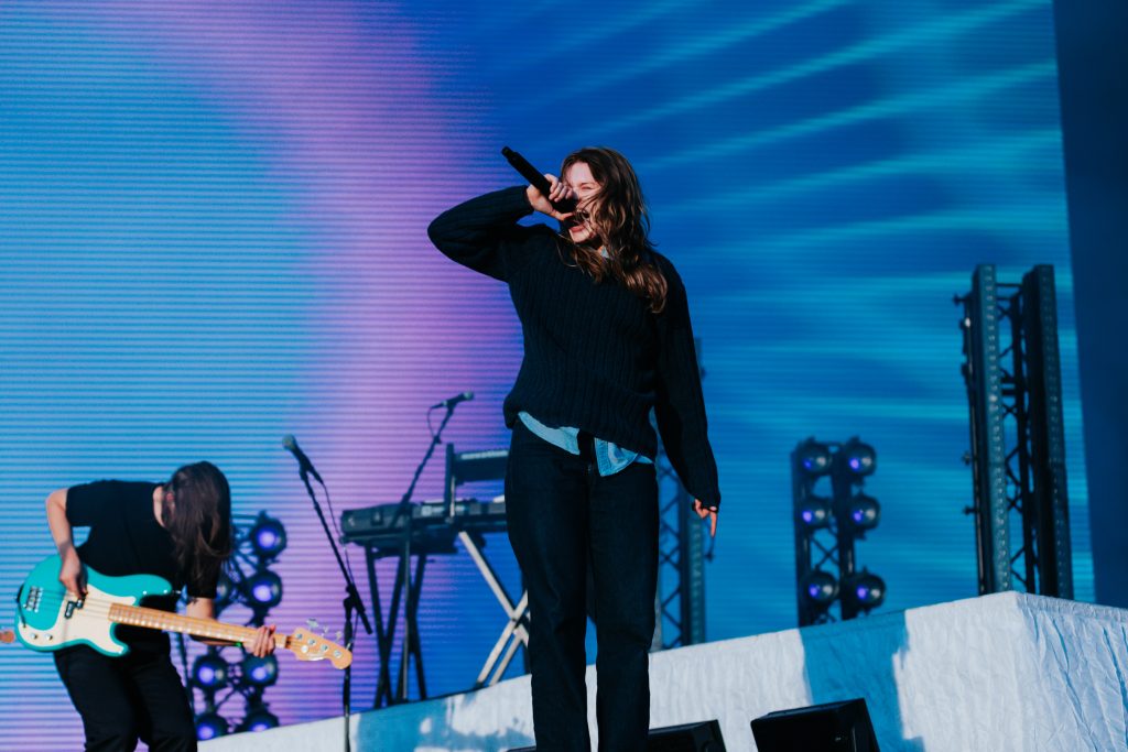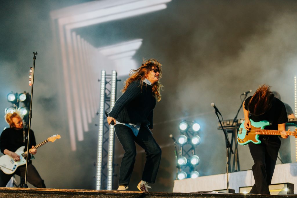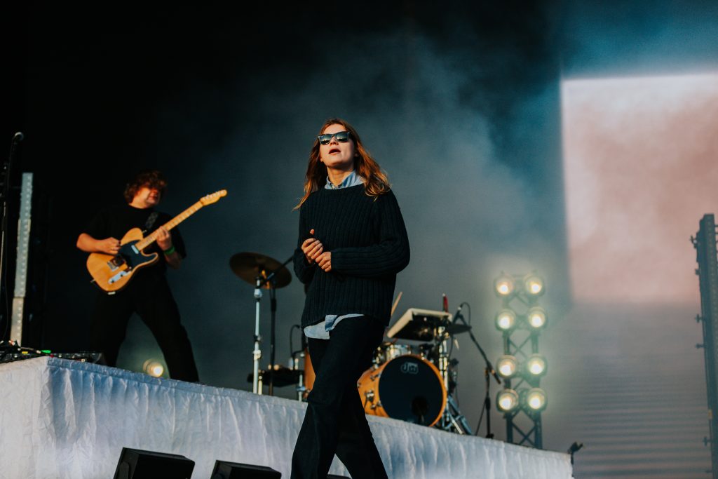 The rest of the supporting lineup for Haim’s headline show at All Point East has also been carefully curated to get the crowd as Haim-worthy as possible. The Cupra North tent plays host to Australian electro-pop party starters Confidence Man after Romy’s deliciously feel-good set while the L’Oreal Paris stage honours the band’s more folk-rock inspirations. Paris Paloma starts her set with the hushed gloom of ‘Notre Dame’ before the haunted, rugged ‘Mulled Wine’ brings a quiet over the buzzing festival crowd. Elsewhere, Nell Mescal’s set is far more chaotic. “There’s too many of you here, go away,” she beams after the raucous reaction to ‘Cutting Ties’ while ‘Punchline’ and ‘Homesick’ have bloomed into swaggering festival anthems in recent months. New song ‘Teeth’ sees that assurance continue. A smirking revenge anthem about someone reading her diary, she twists vulnerability into snarling power.