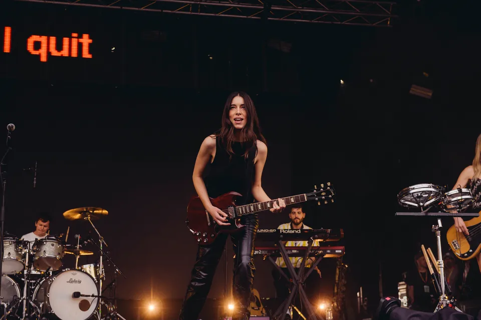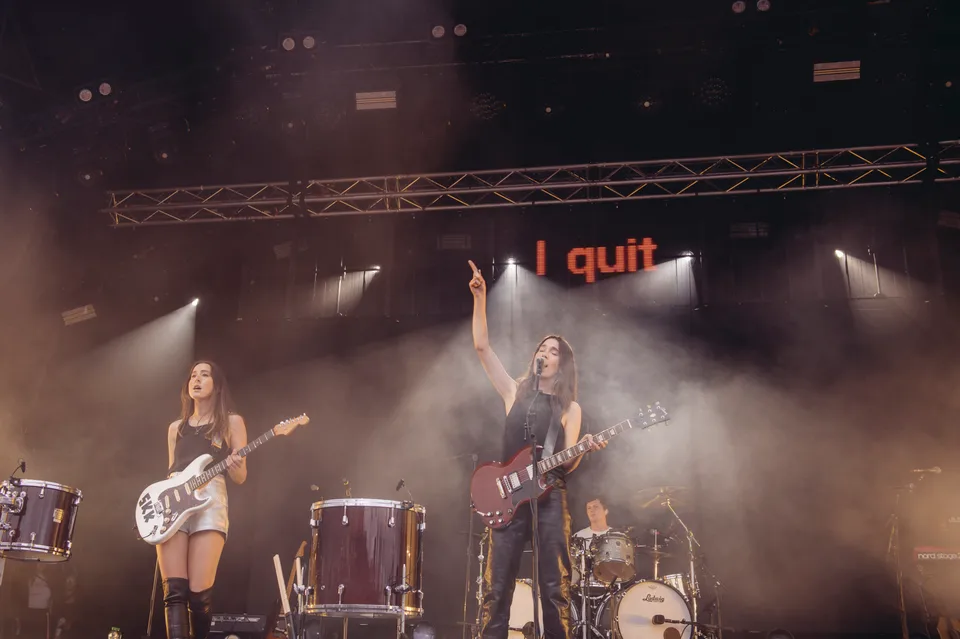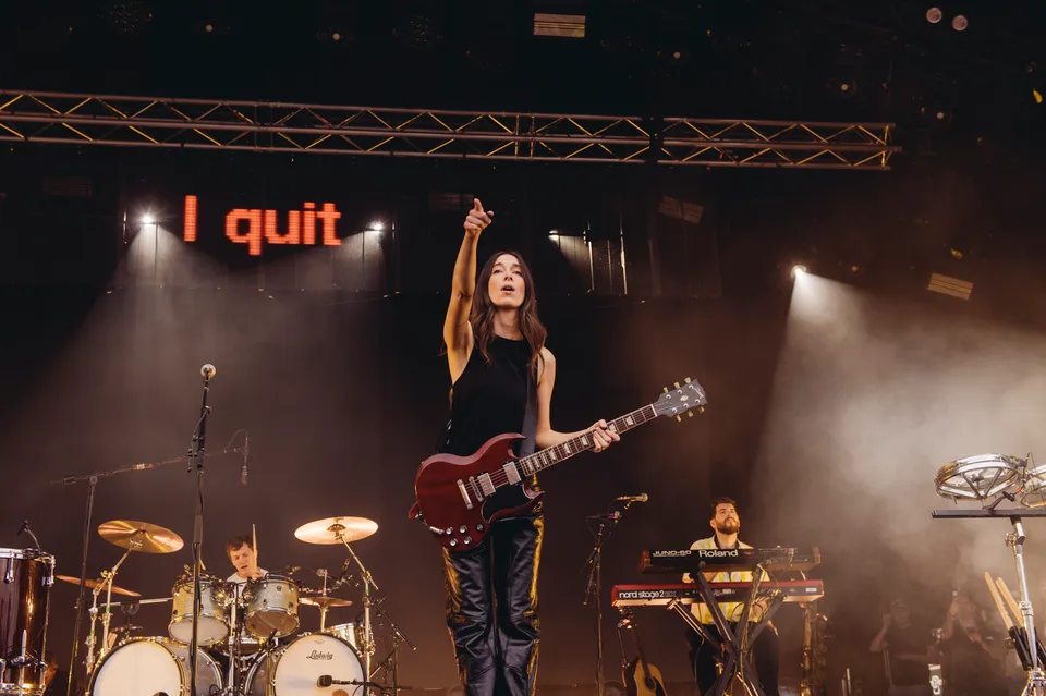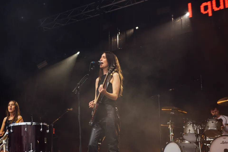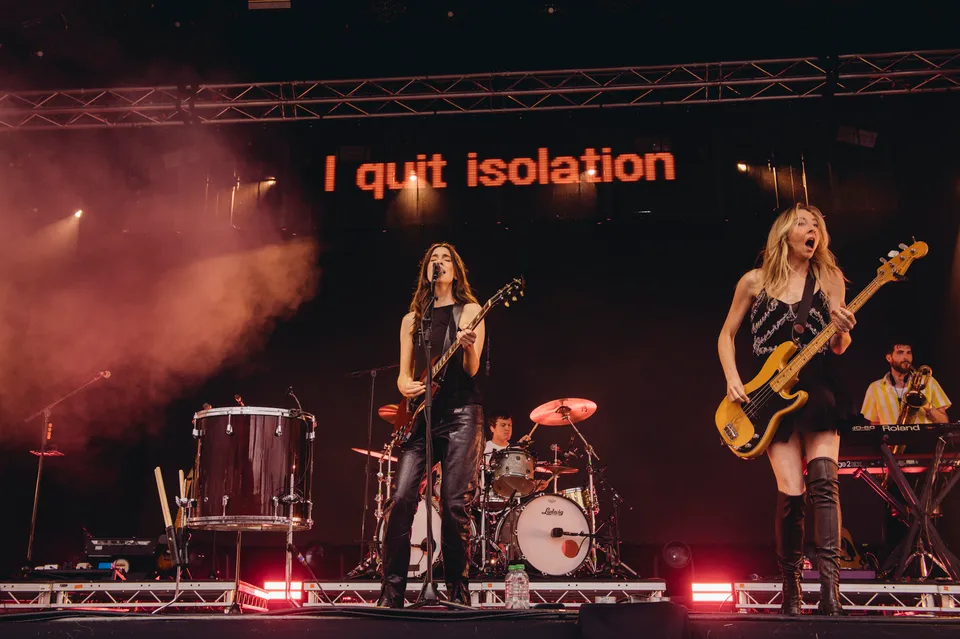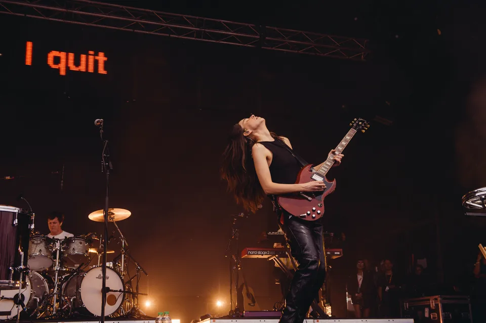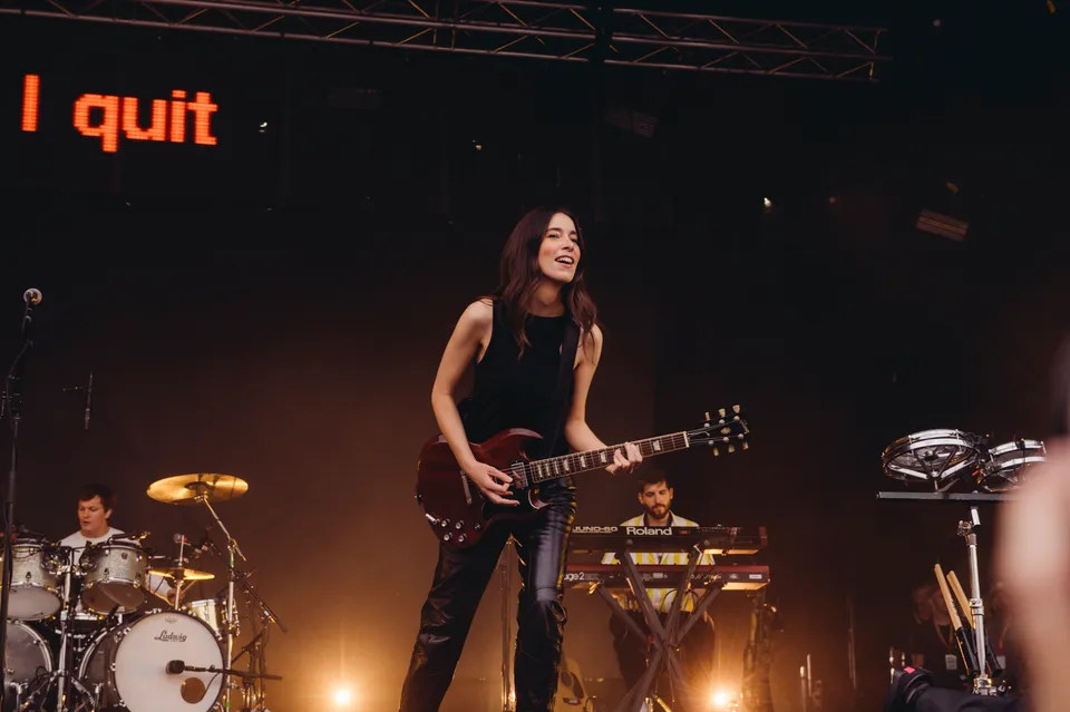 But the evening is not just a nostalgia trip. The front‑of‑stage LED screen flashes the words "I Quit" in huge red letters between numbers, a blunt visual cue that new material will be taking centre stage. 'Relationships' is the first to arrive. It lands surprisingly hard live, punchier than the studio cut and tailor‑made for open air. A few songs later, 'Everybody's Trying to Figure Me Out' pushes further, looser here than on record, powered by Este's muscular bassline and a groove roomy enough to dance in.