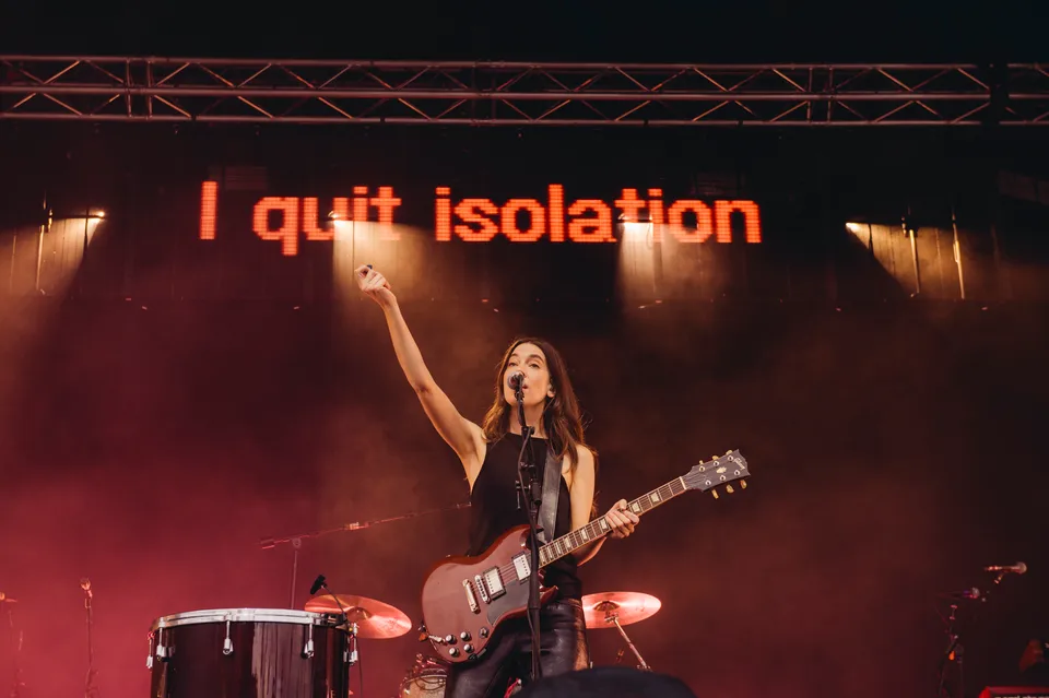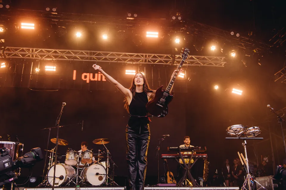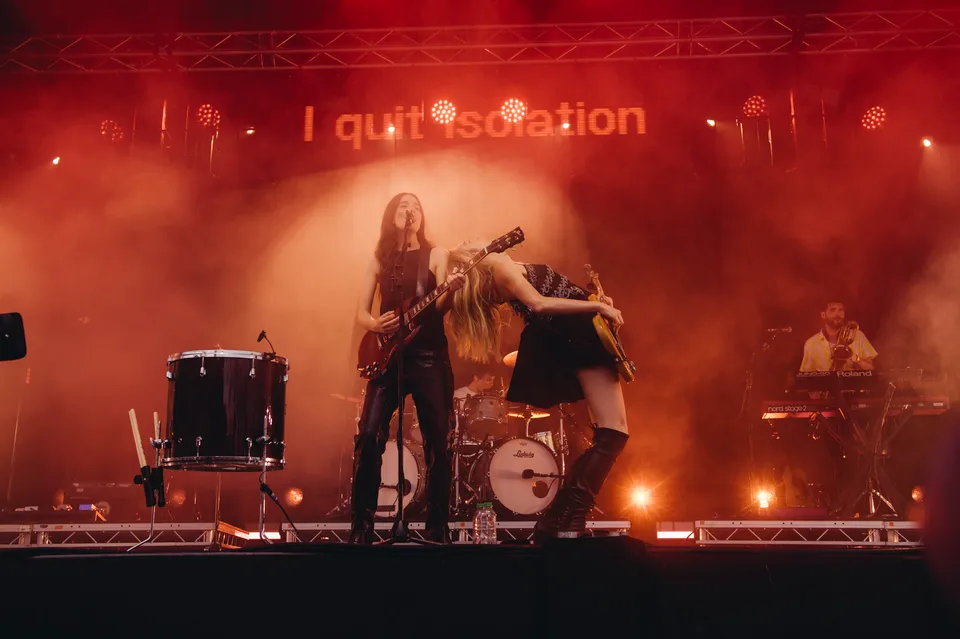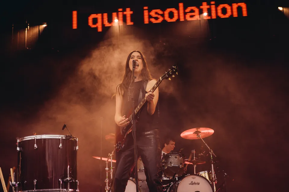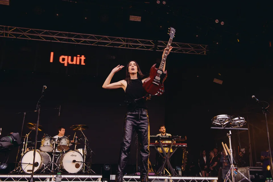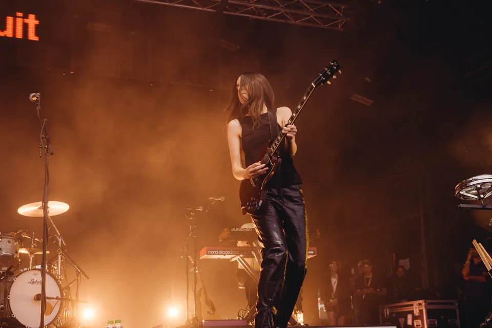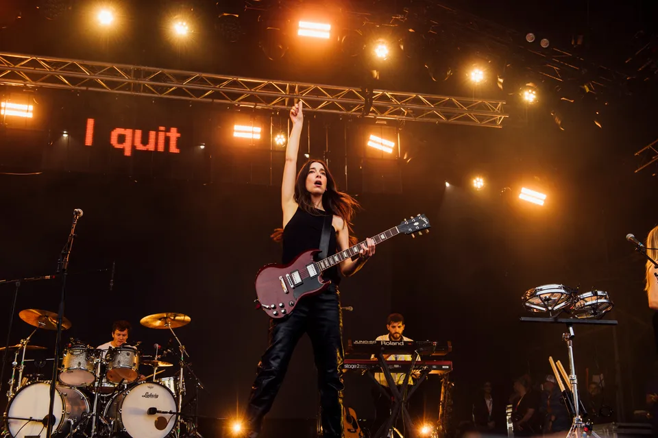 But the evening is not just a nostalgia trip. The front‑of‑stage LED screen flashes the words "I Quit" in huge red letters between numbers, a blunt visual cue that new material will be taking centre stage. 'Relationships' is the first to arrive. It lands surprisingly hard live, punchier than the studio cut and tailor‑made for open air. A few songs later, 'Everybody's Trying to Figure Me Out' pushes further, looser here than on record, powered by Este's muscular bassline and a groove roomy enough to dance in.