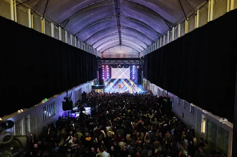 Venue number two is in an old converted cinema down the road, just past the hot dog stand Bill Clinton once visited (yes, really). Inside, Canadian collective Crack Cloud are doing their best to see just how many people and instruments can fit on one stage. The harpist, in particular, must have had a hell of a time getting through customs, but the result is more than worth the hassle.