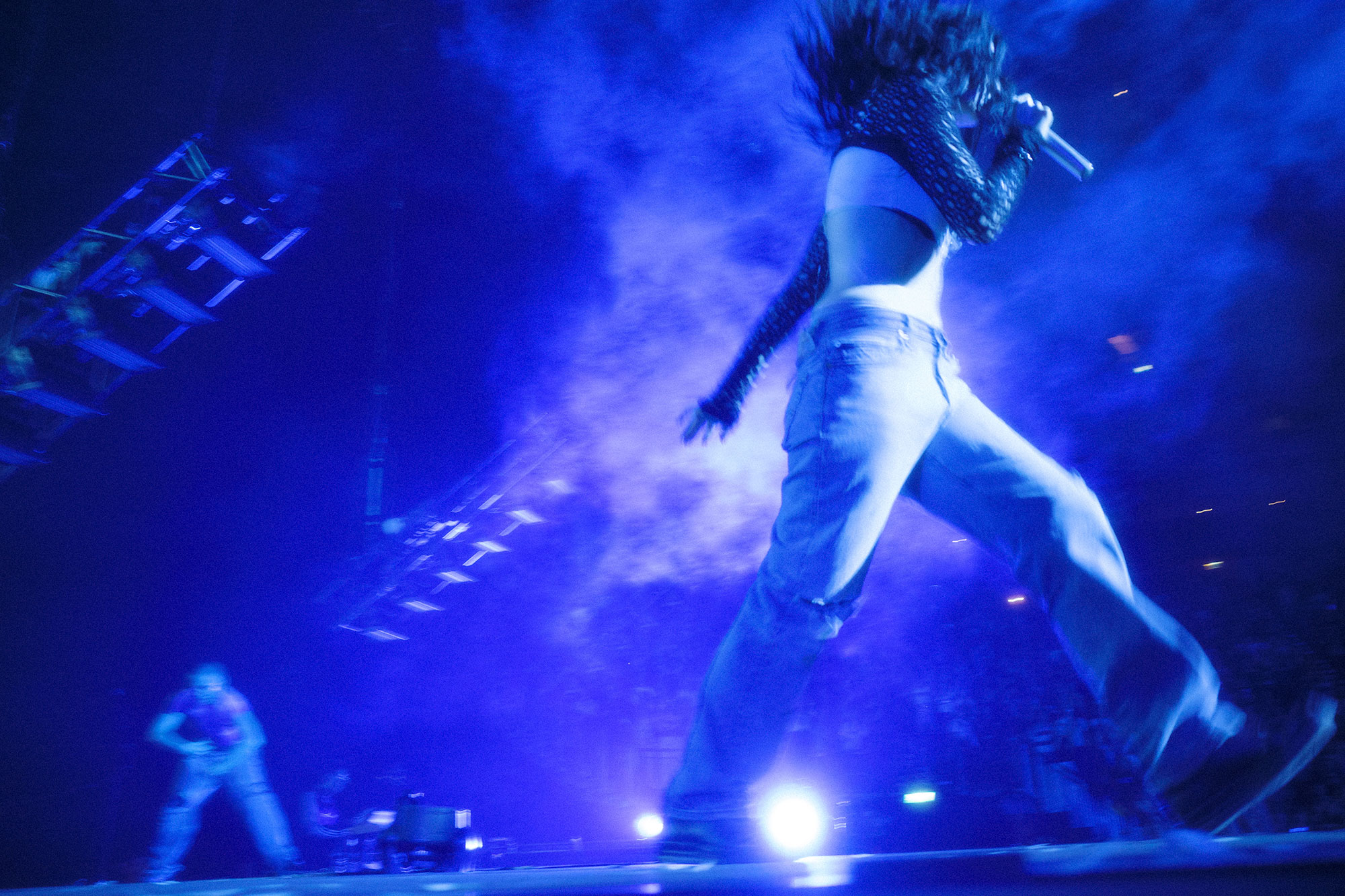 So Lorde winds up back in the city in the biggest room she's ever played here, and yet the album she's touring may be her most intimate. As she emerges from a trap door in the middle of the stage with 'Hammer', a blue light recreates the album artwork across her lower abdomen; when she frees herself, she's thrown back into her usual thrashing, though this time it feels somehow considered and intentional.