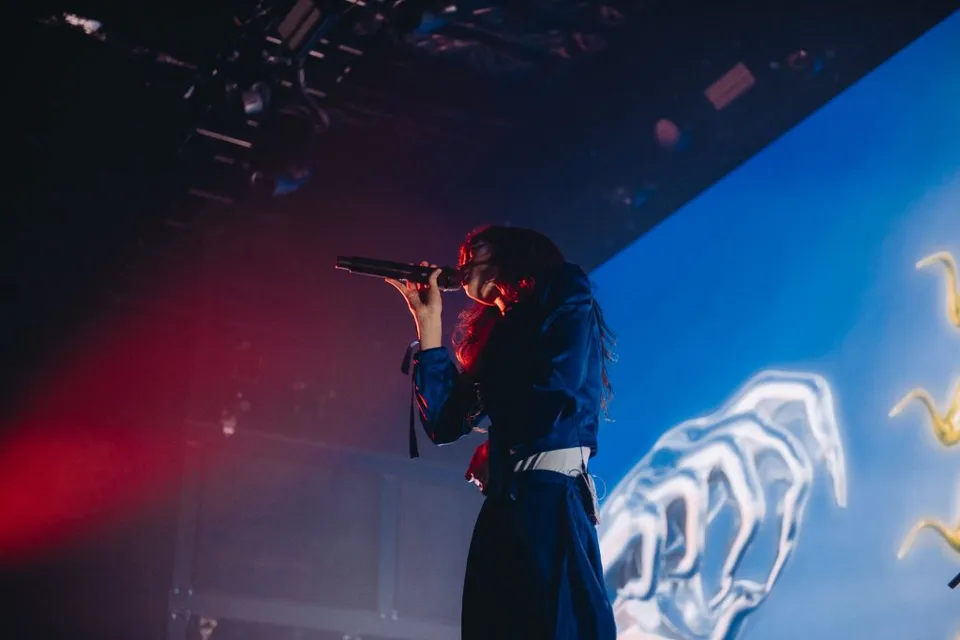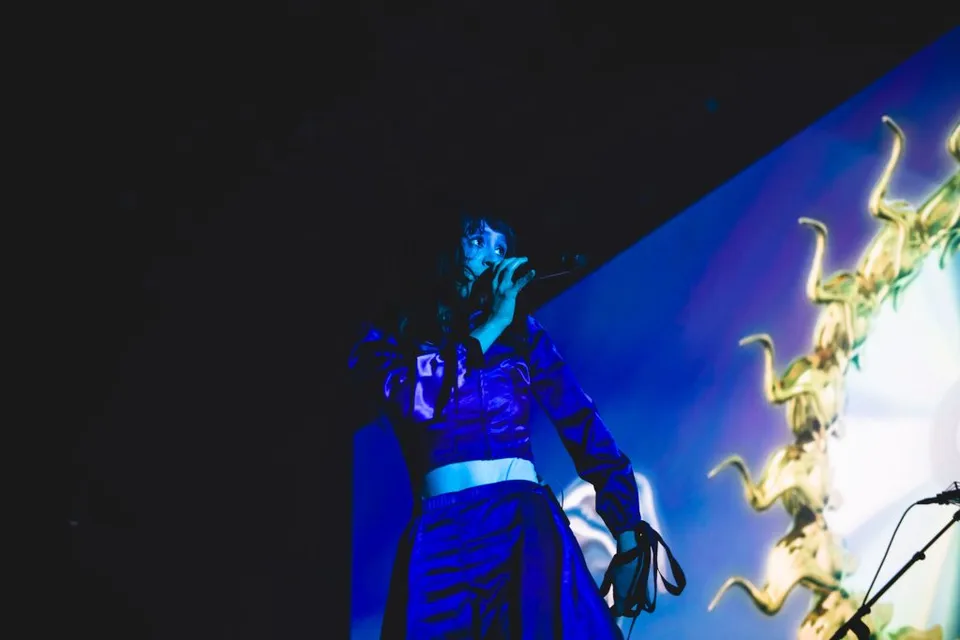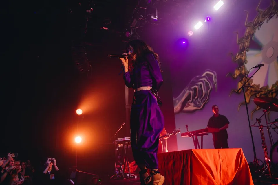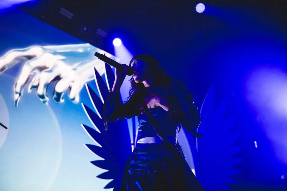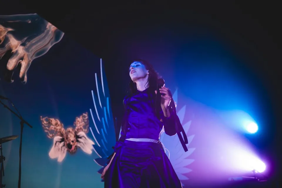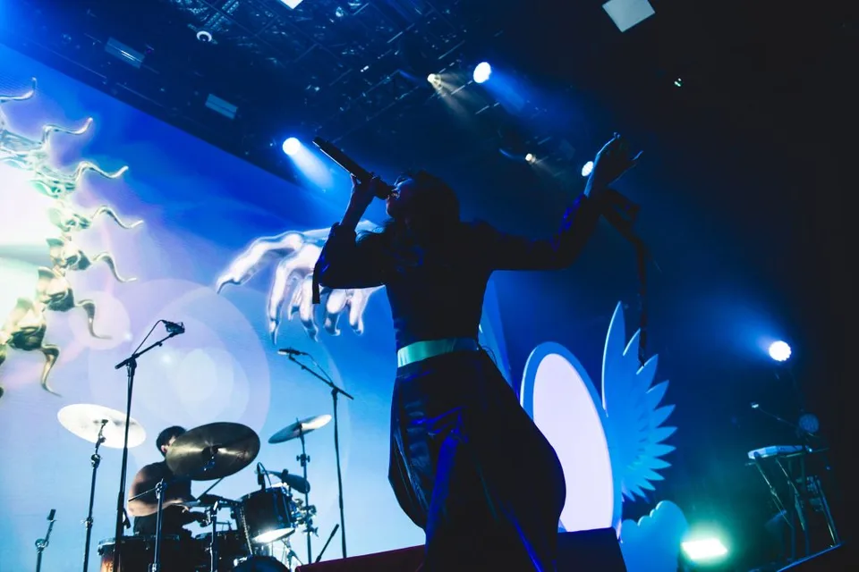 Stepping downstairs into London’s HERE at Outernet, you’re met with a fantastical scene projecting from the screens at the back of the stage; blue skies and a CD sun that, erm, resembles a Beyblade, and two chrome hands reaching out to touch it at either side. On the stage itself stands a magic mirror with angel wings (remember when we mentioned hallucinogenics?).