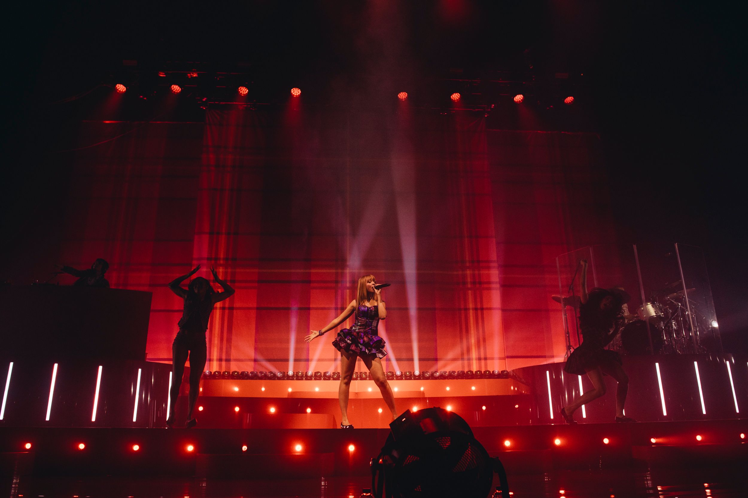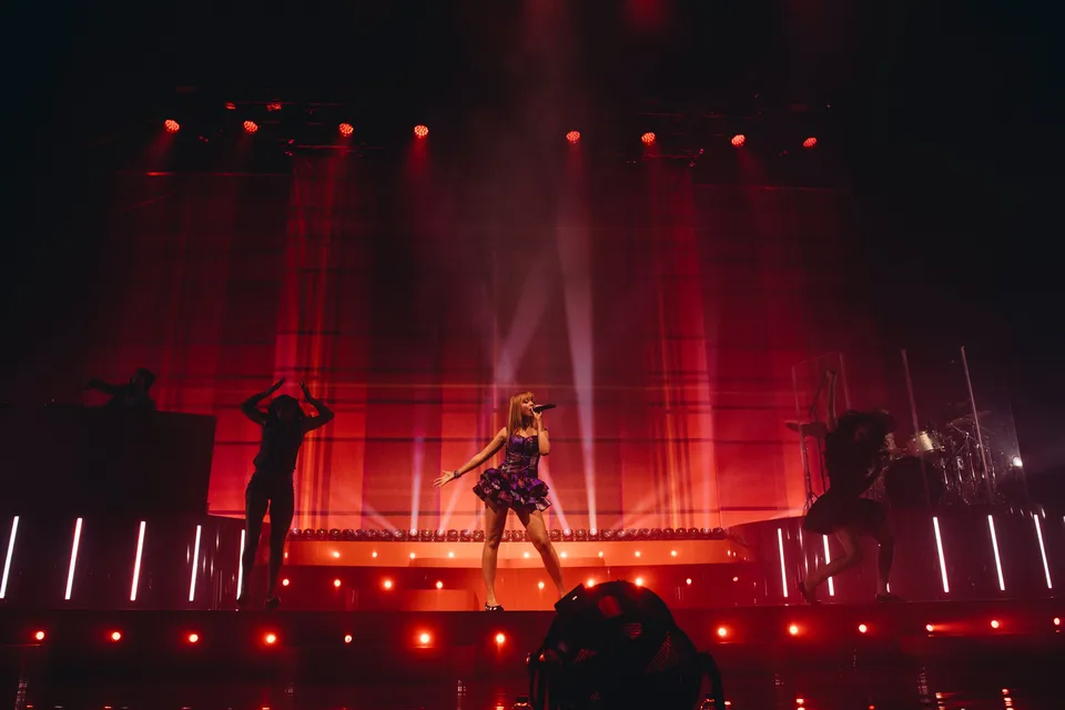 August 2024 saw Pink cancel her tour dates for the remainder of the year, including high festival billings and a stint opening on Olivia Rodrigo’s ‘GUTS’ tour in the US; when she reemerged this spring, something had shifted. Her music, emo-indebted and melodramatic on mixtape ‘to hell with it’ and debut album ‘Heaven knows’, was bouncier and flirtier on ‘Fancy That’. Her performance tonight reflects that transformation, and while the venue is half the capacity of her last London headline at Alexandra Palace, the production is ten times bigger.