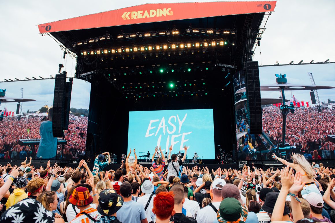 Easy Life's Murray Matravers makes sure his entrance to Reading Festival doesn't go unnoticed, marching on stage while screaming raucously and proceeding to launch tinnies at his loyal fans.