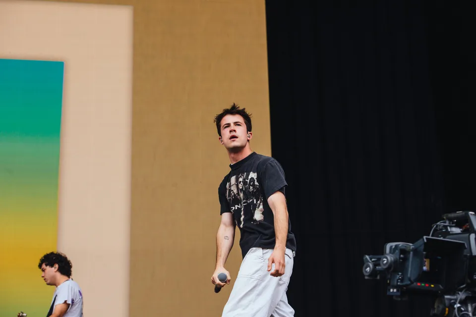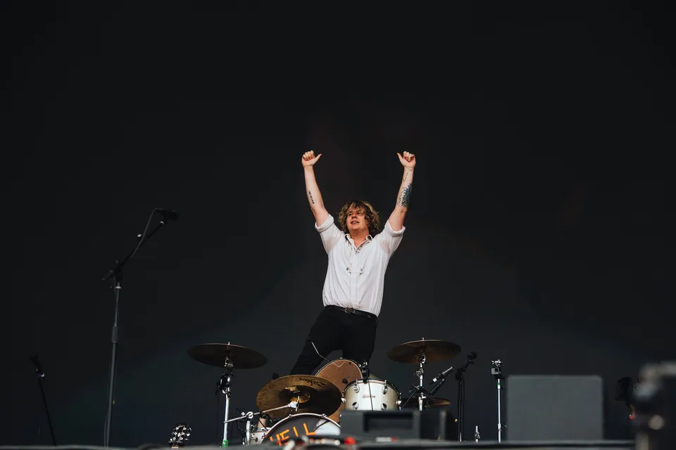 LA charmers Wallows bring their luxuriously lo-fi indie pop vibes across the pond, shifting their show from the likes of Lollapalooza and Coachella to the slightly soggy fields of England. Fortunately, their laidback energy isn't lost on the crowd, who turn near feral as soon as the Indiana Jones theme backs the trio's entrance. Opening with 'I Don't Want To Talk', a cut from March's 'Tell Me That It's Over', Dylan Minnette's lead vocals start off rough but quickly shake off the jet leg - a delightful turn on the harmonica seems to help. When Braeden Lemasters joins him with harmonic backing, their charm is irresistible.