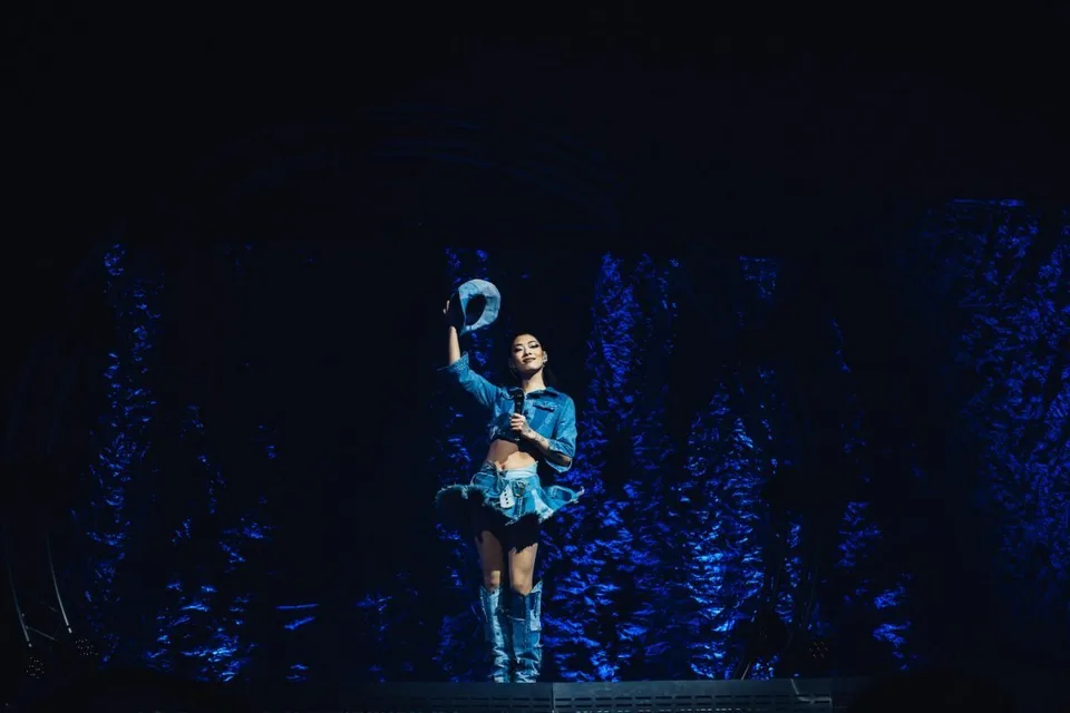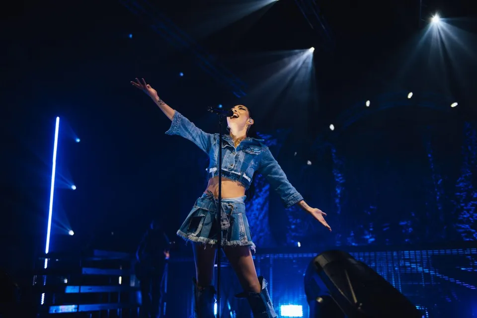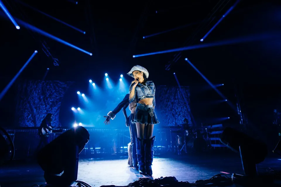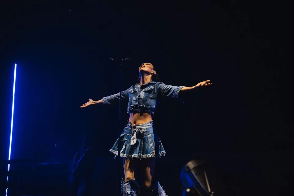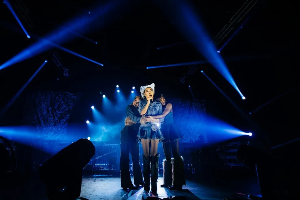 Atop an elevated metal platform and framed in a circle of spotlights, Rina steps out to a completely rammed Brixton Academy, a stage clearly designed with those at the back in mind (and trust us, the crowd goes as far as it possibly can). Caped in denim, she kicks off ‘Act 1’ with the affecting album opener ‘Minor Feelings’, her voice better than ever, and plunges straight into ‘Hold The Girl’, physically embraced by her two backing dancers.