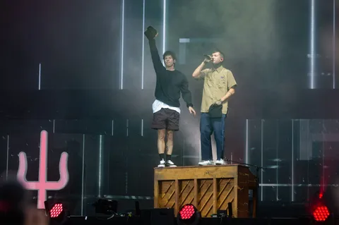 Dom Harrison is at his usual levels of 125% chaos, leaving one punter in a heavy metal t-shirt musing afterwards, “We don’t usually have stuff like that here. But I… think I like it?” Later that same night, Twenty One Pilots are the next to cast off safety and consistency for something altogether more exciting. An entire festival field is permanently scarred with second-hand fear by Tyler Joseph climbing up untethered to PRETTY MUCH THE ACTUAL TOP OF THE FESTIVAL STAGE at the climax to ‘Car Radio’. Standing on top of the lighting rig about 30 metres up staring down at the rest of the world, you couldn’t find a more accurate reflection on where Tyler and Josh find themselves these days.