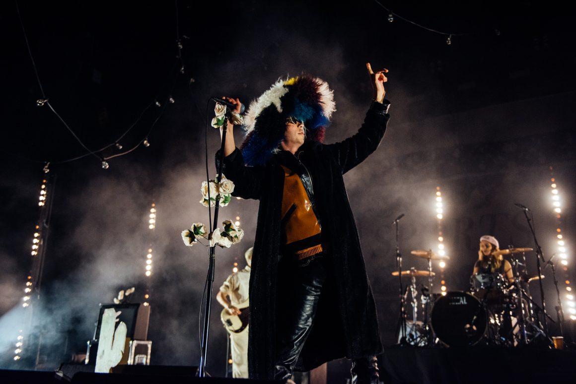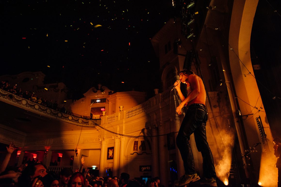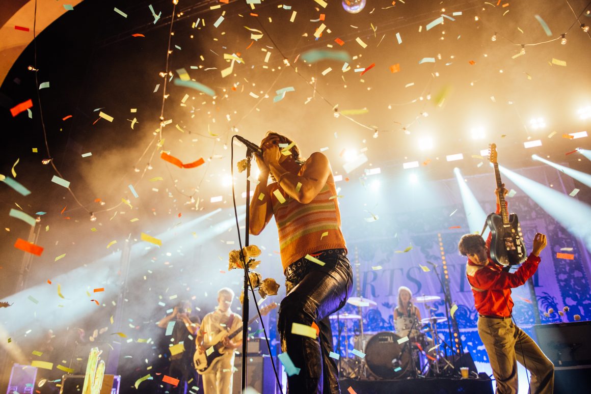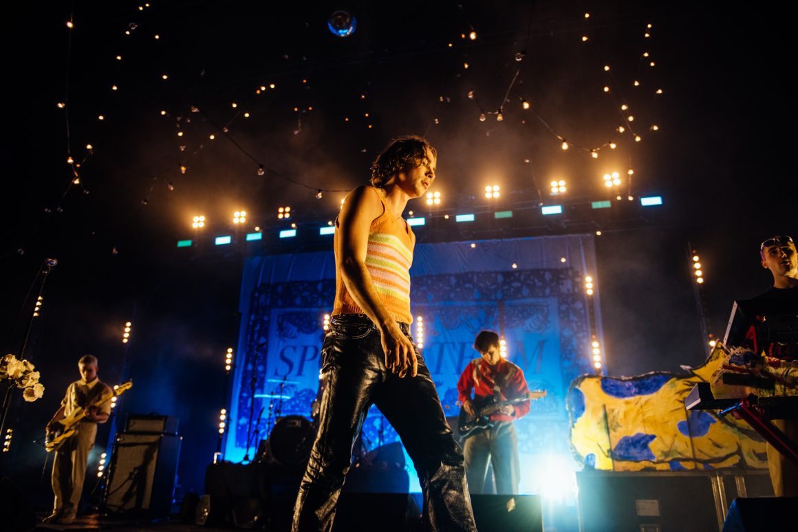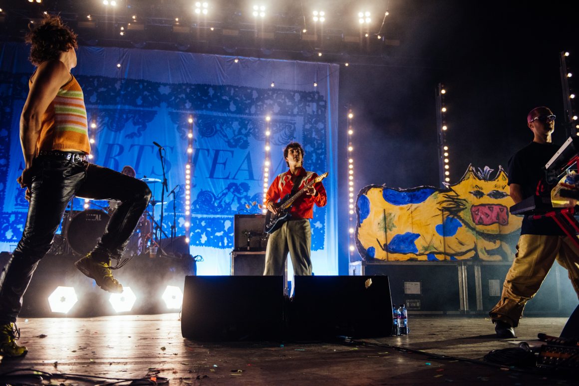 By the end of the one-two punch of ‘Here it Comes Again’ and ‘Going Soft’, Rice has stripped down to a vest and leather trousers, presumably to better facilitate bounding around stage and dancing like he’s trying to pull a muscle. ‘Margate’ is up next, with the band flexing the biggest show of their career by setting off confetti cannons just three tracks into the set. A pause follows, with the seething masses grateful to catch their breath. Ever the charmer, Rice takes the opportunity to tell them that they’re “the greatest fans in the world”, although we don’t think he’s a very objective source for that.