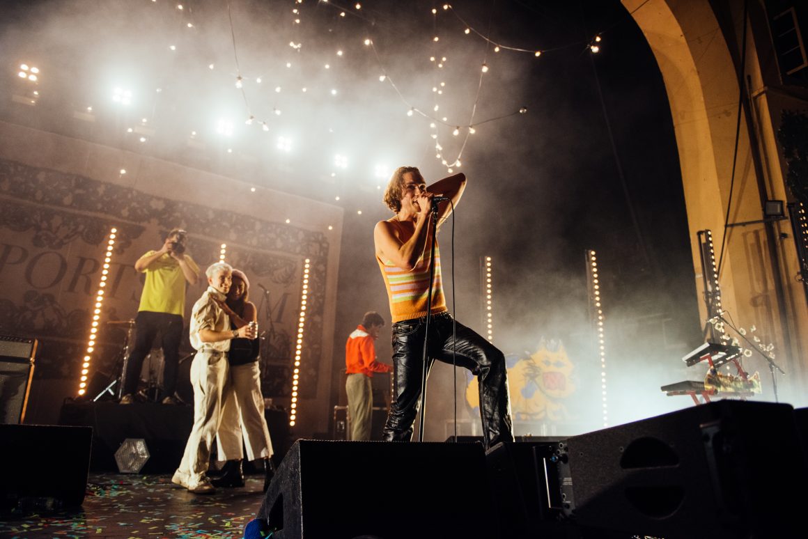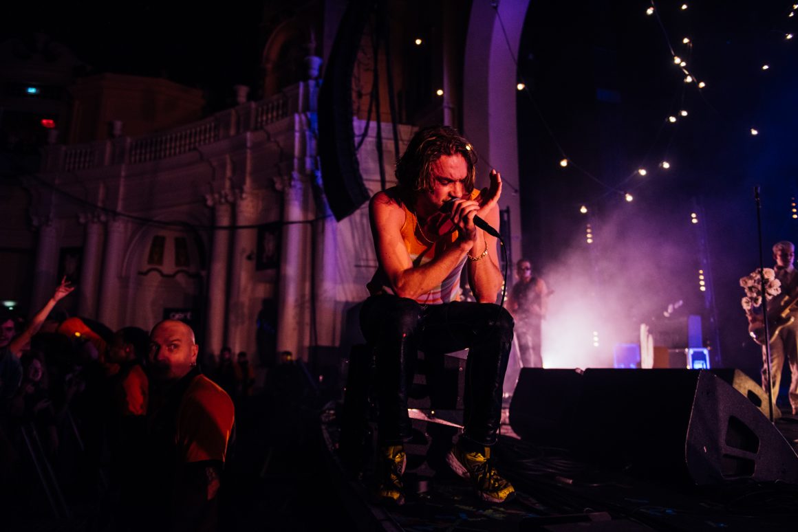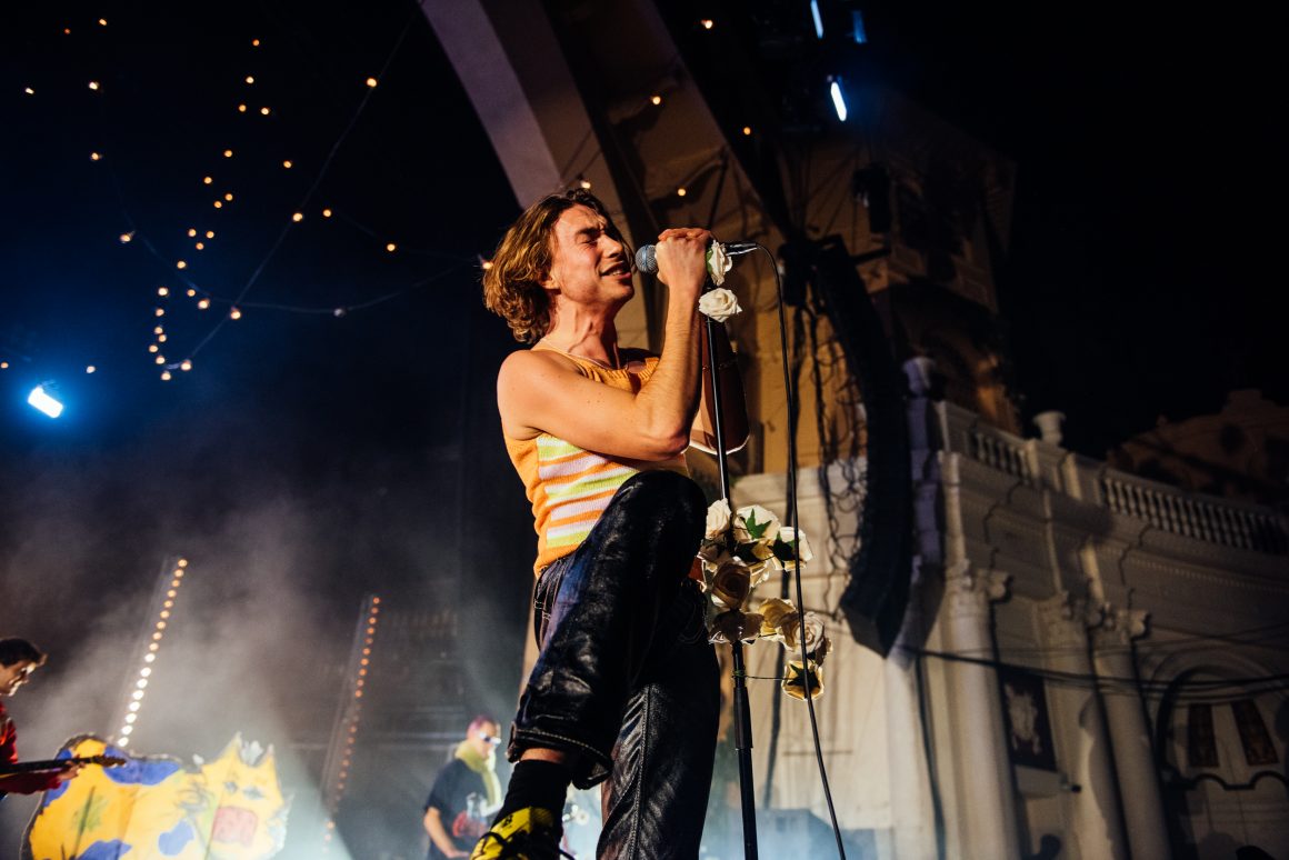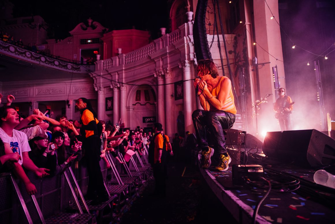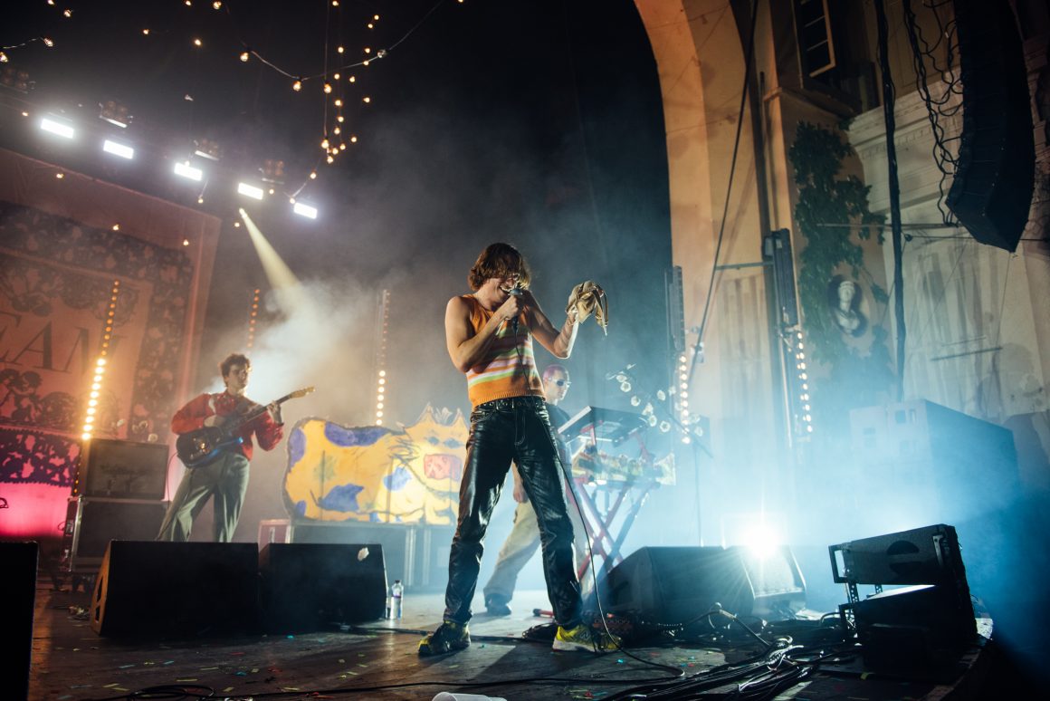 By the end of the one-two punch of ‘Here it Comes Again’ and ‘Going Soft’, Rice has stripped down to a vest and leather trousers, presumably to better facilitate bounding around stage and dancing like he’s trying to pull a muscle. ‘Margate’ is up next, with the band flexing the biggest show of their career by setting off confetti cannons just three tracks into the set. A pause follows, with the seething masses grateful to catch their breath. Ever the charmer, Rice takes the opportunity to tell them that they’re “the greatest fans in the world”, although we don’t think he’s a very objective source for that.