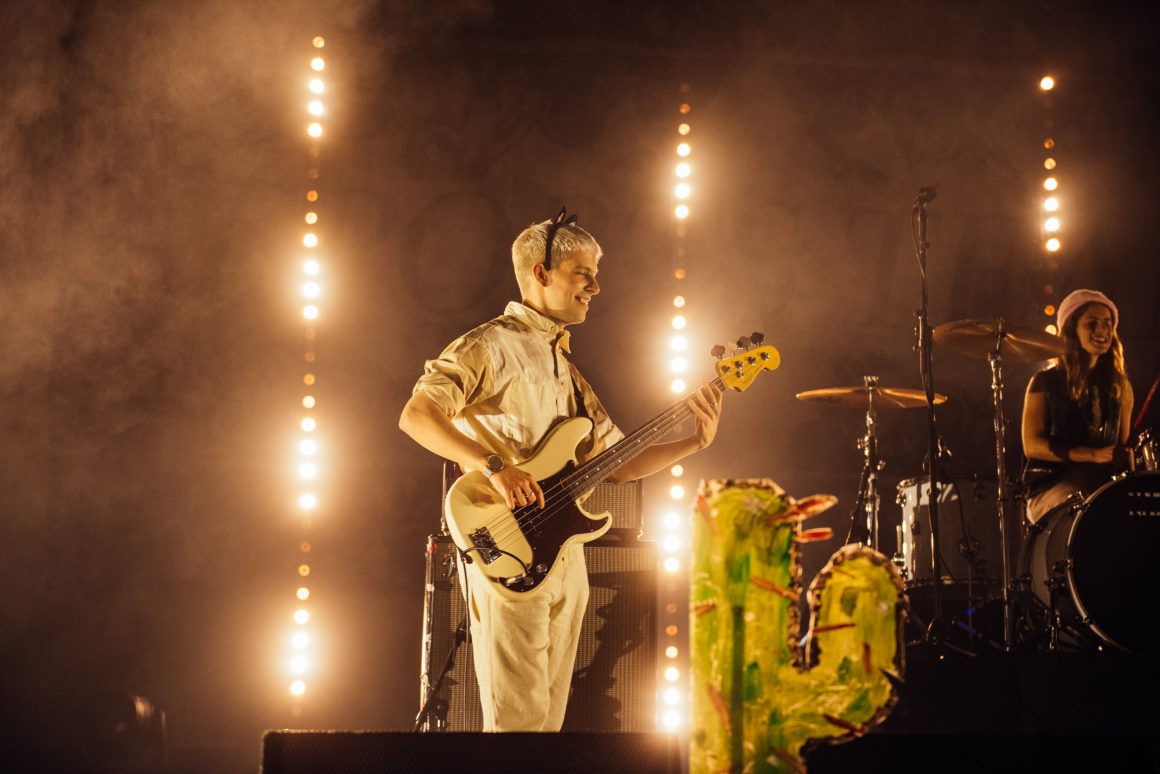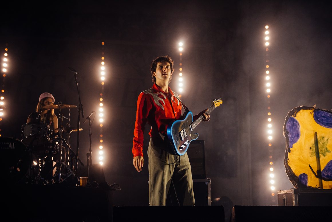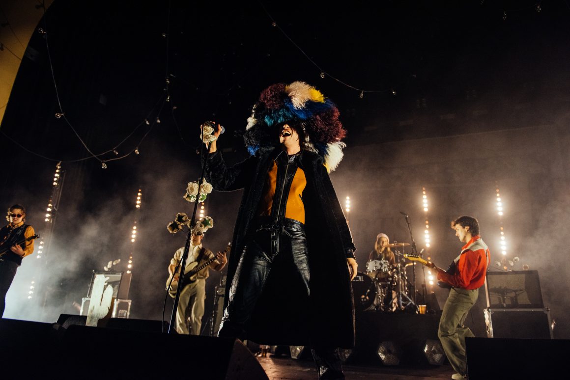 They seem to get the memo, striding out to Abba’s ‘Mamma Mia’ while clad in more Fiorucci than you can shake a stick at. Alex Rice, ever the centre of attention, is wearing what looks like a black cape and the kind of hat that Cruella De Ville might wear if she was feeling extra glamorous. With the budget blown on clothes, not much is left over for the fairy lights strung from the ceiling, with half falling down before the first track even gets played. It wouldn’t be Sports Team without a bit of chaos, would it?