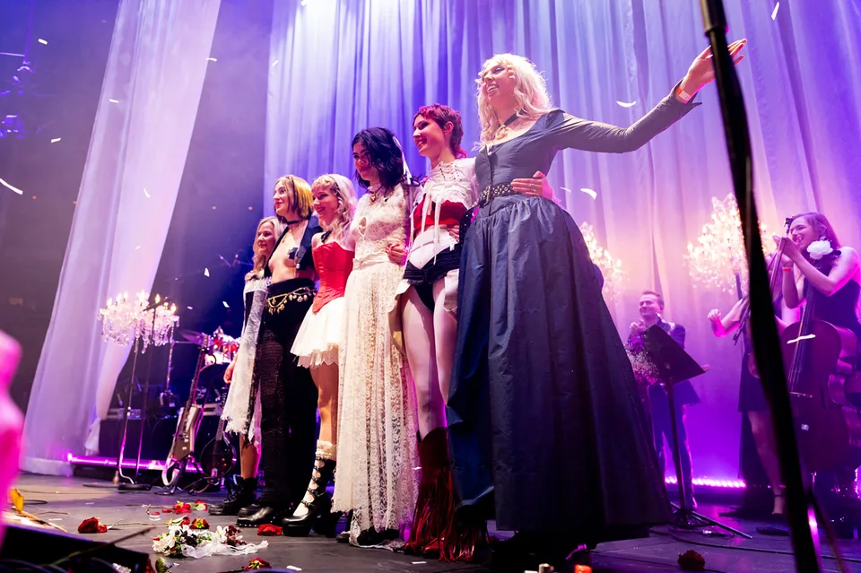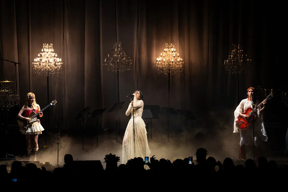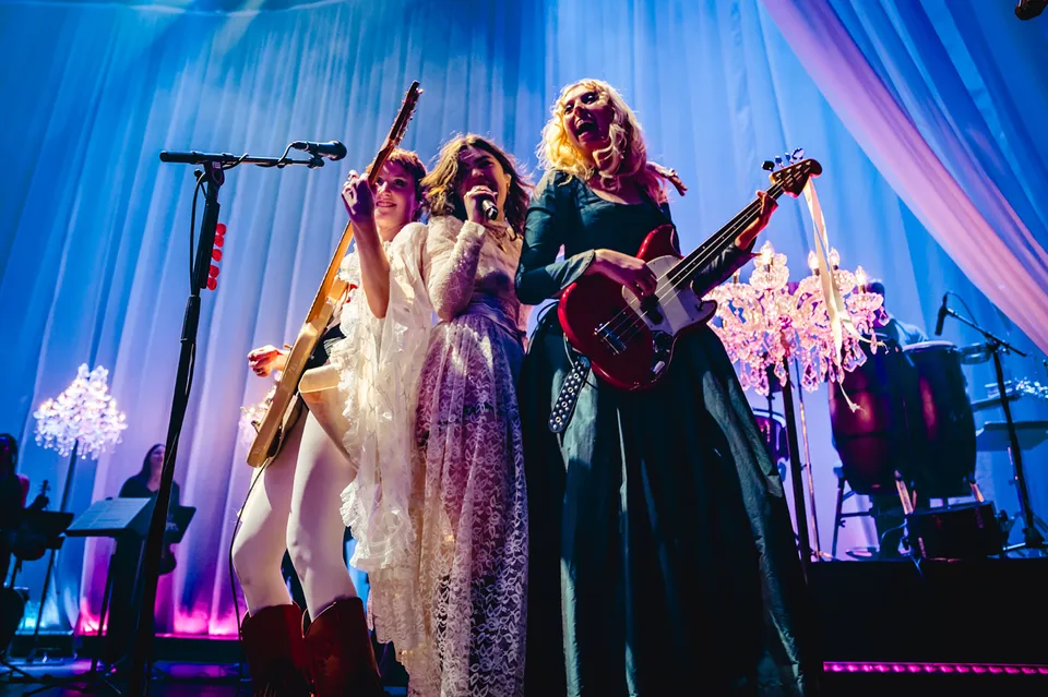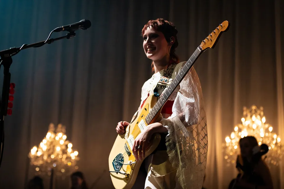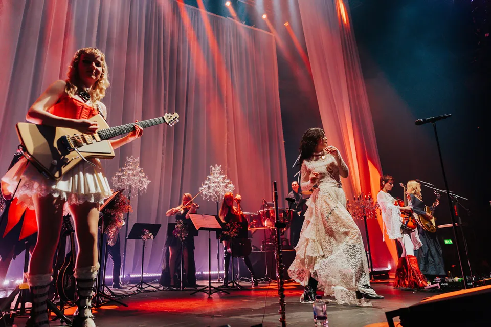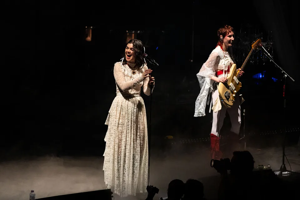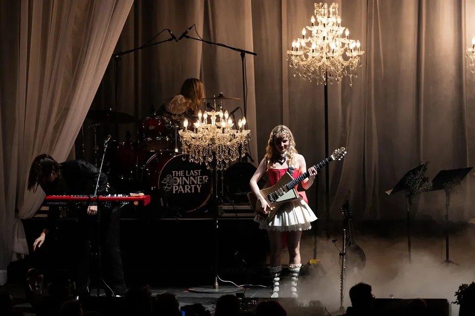 Later, after returning from a reluctant encore, The Last Dinner Party are joined by a number of classical musicians. Led by Aurora Nishevci, the group performs the orchestral 'Prelude To Ecstasy' before they rework chaotic live favourite 'Godzilla' into a swaggering rock'n'roll number that channels Elton John, Queen and Paramore. Featuring everything from epic guitar solos and sax breakdowns to bongos, it's excessive and indulgent, but when have The Last Dinner Party been anything but?