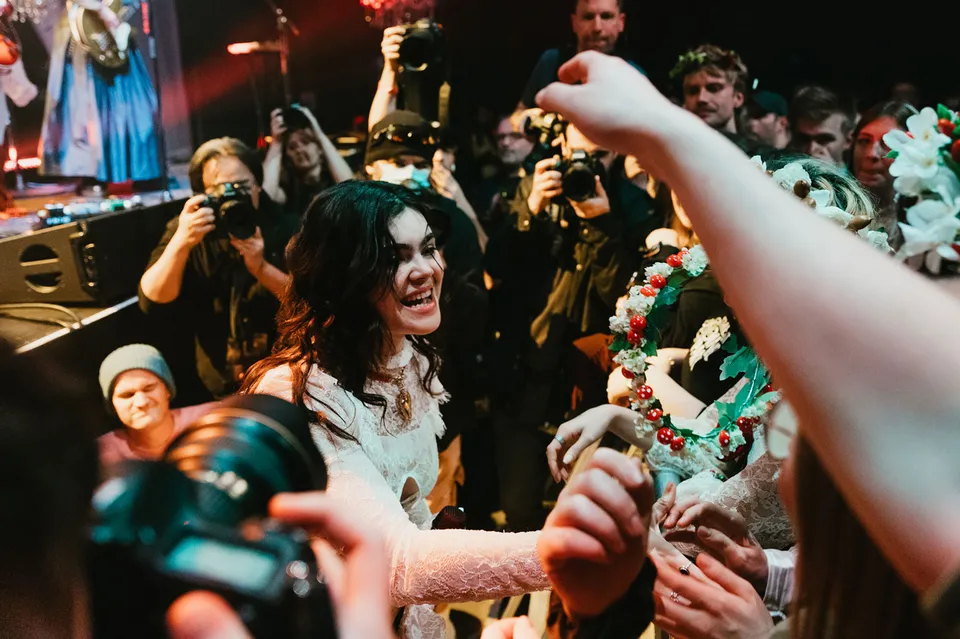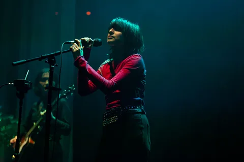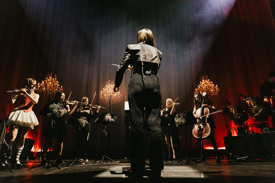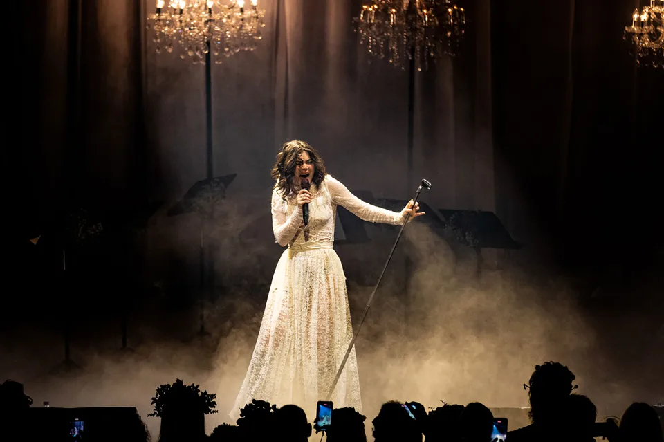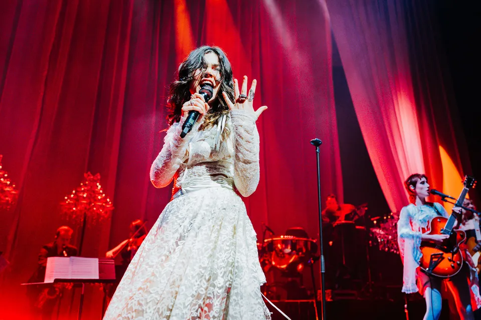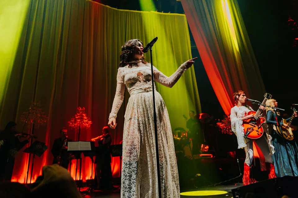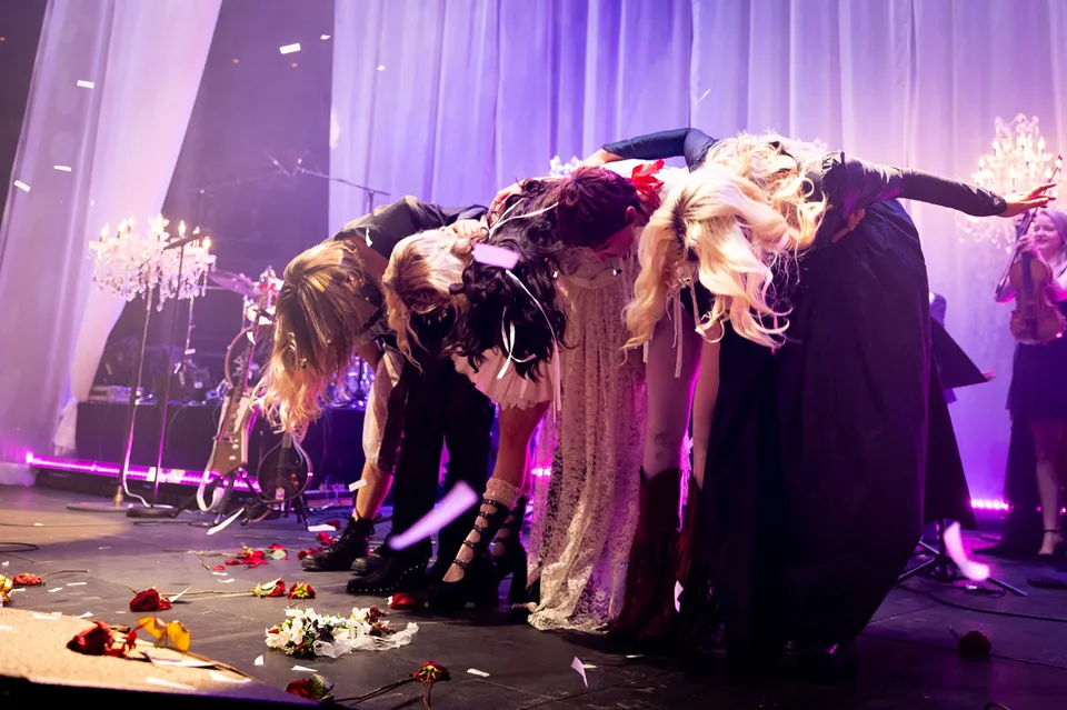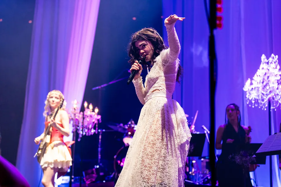 Later, after returning from a reluctant encore, The Last Dinner Party are joined by a number of classical musicians. Led by Aurora Nishevci, the group performs the orchestral 'Prelude To Ecstasy' before they rework chaotic live favourite 'Godzilla' into a swaggering rock'n'roll number that channels Elton John, Queen and Paramore. Featuring everything from epic guitar solos and sax breakdowns to bongos, it's excessive and indulgent, but when have The Last Dinner Party been anything but?