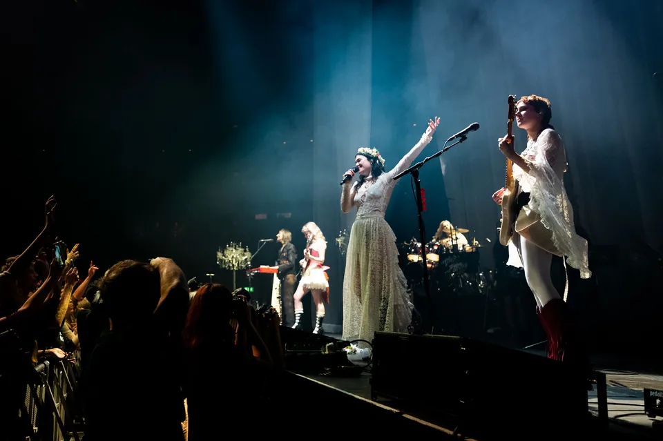 There's plenty of that with The Last Dinner Party as well, but things start with more restraint. The crowd literally roars as the band takes to the stage, but they reply with a five-part vocal harmony that tumbles into a gorgeous, slow-burning a capella version of 'Beautiful Boy'. Following a flurry of chattering bird song, and with the stage draped in white curtains and glowing chandeliers, it feels like the start of a Disney movie rather than a rowdy album launch party thrown by Britain's most exciting guitar group. It's not the first dizzying turn tonight's show takes, either.