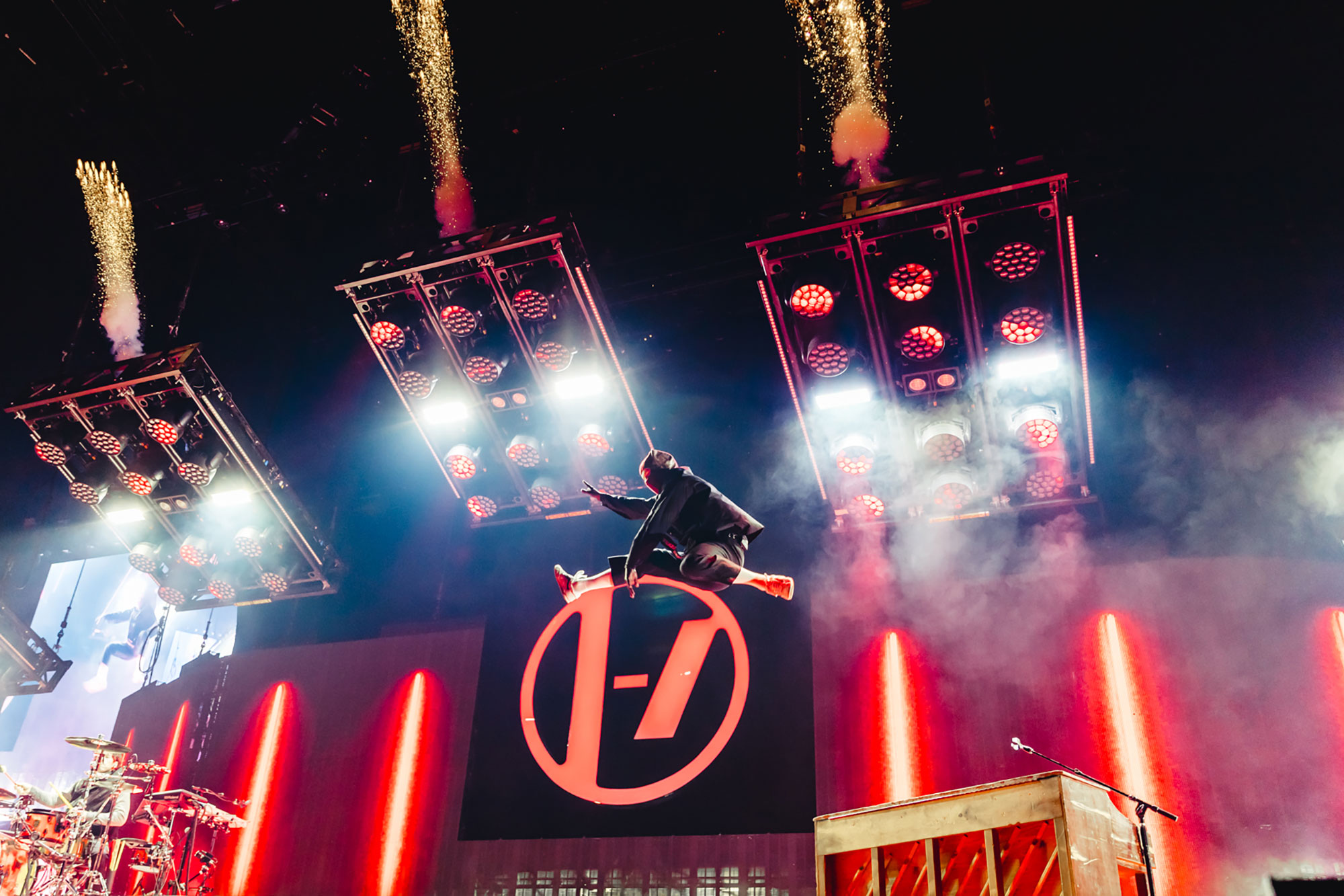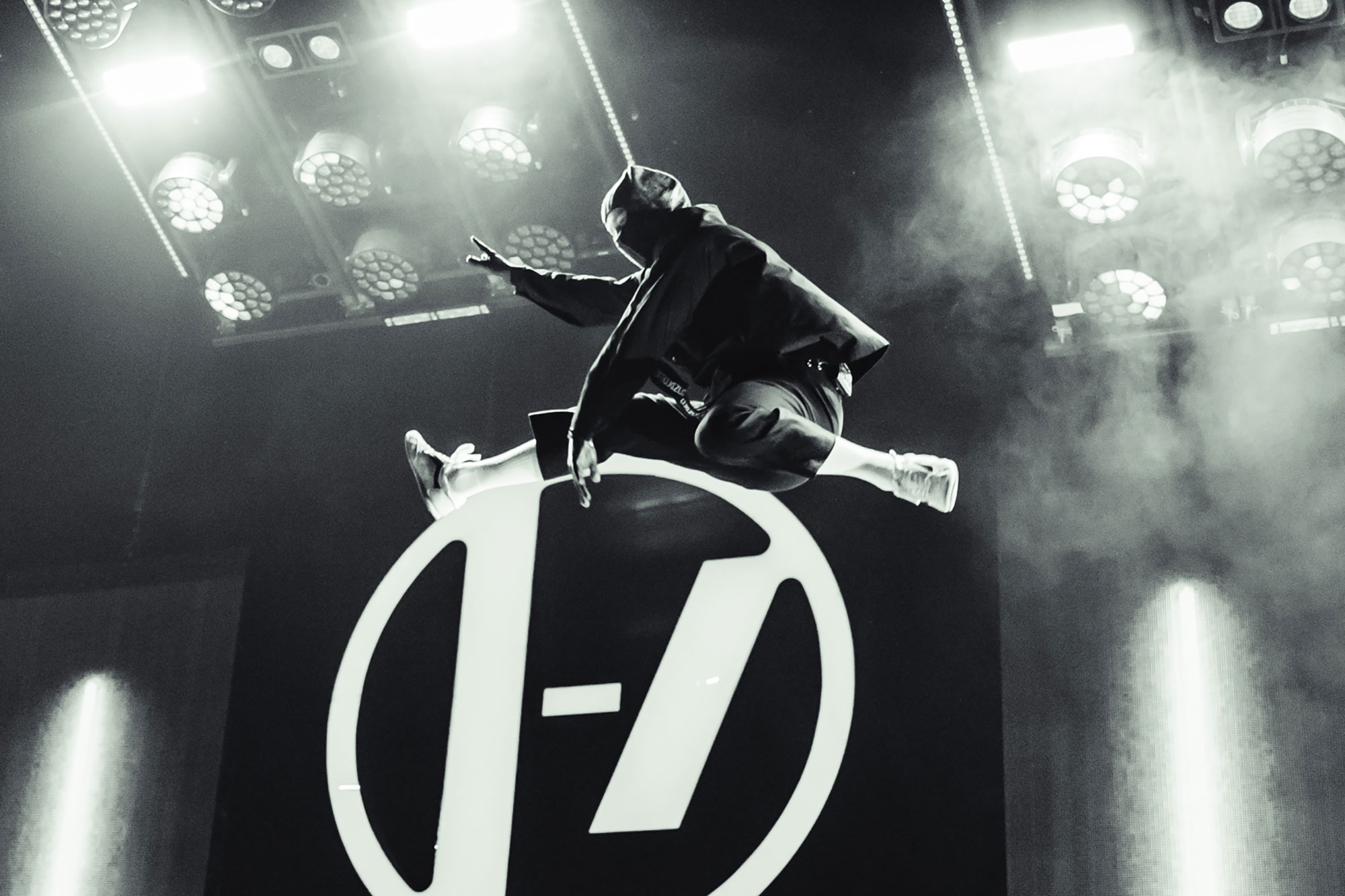 As you’d expect from a group who still confidently wear that crown, tonight’s gig at London’s O2 Arena is outrageously massive. Fireworks regularly erupt from across the stage; moving video screens pepper the two-hour show with a cinematic dystopian narrative about rebellious freedom, and on two separate occasions, Tyler Joseph and Josh Dun disappear from the stage and suddenly reappear at the opposite end of the cavernous venue as if by magic.